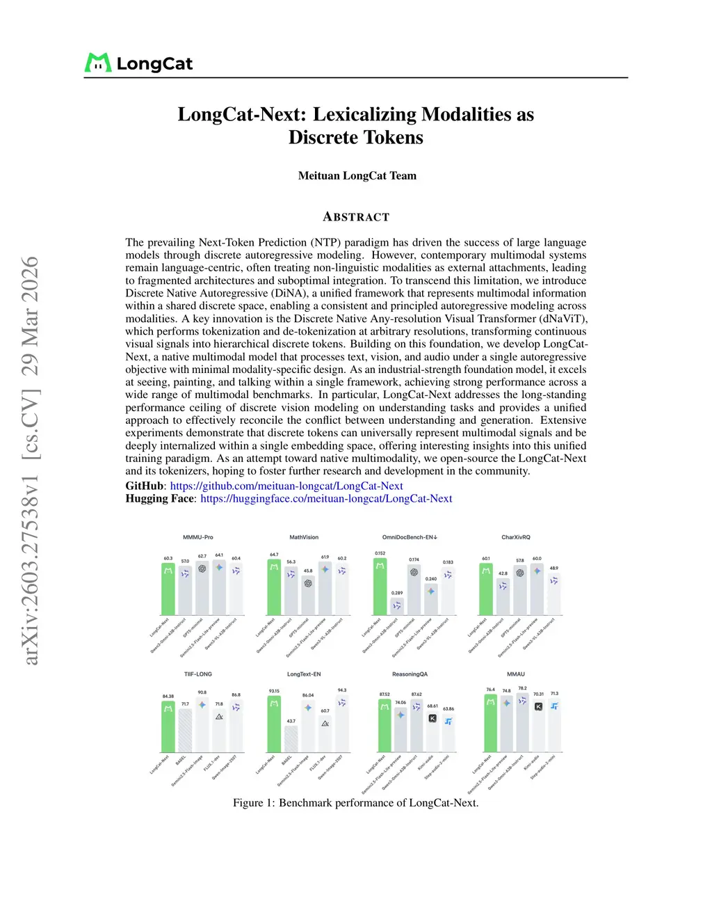 The prevailing Next-Token Prediction (NTP) paradigm has driven the success of large language models through discrete autoregressive modeling. However, contemporary multimodal systems remain language-centric, often treating non-linguistic modalities as external attachments, leading to fragmented architectures and suboptimal integration. To transcend this limitation, we introduce Discrete Native Autoregressive (DiNA), a unified framework that represents multimodal information within a shared discrete space, enabling a consistent and principled autoregressive modeling across modalities. A key innovation is the Discrete Native Any-resolution Visual Transformer (dNaViT), which performs tokenization and de-tokenization at arbitrary resolutions, transforming continuous visual signals into hierarchical discrete tokens. Building on this foundation, we develop LongCat-Next, a native multimodal model that processes text, vision, and audio under a single autoregressive objective with minimal modality-specific design. As an industrial-strength foundation model, it excels at seeing, painting, and talking within a single framework, achieving strong performance across a wide range of multimodal benchmarks. In particular, LongCat-Next addresses the long-standing performance ceiling of discrete vision modeling on understanding tasks and provides a unified approach to effectively reconcile the conflict between understanding and generation. As an attempt toward native multimodality, we open-source the LongCat-Next and its tokenizers, hoping to foster further research and development in the community. GitHub:this https URL