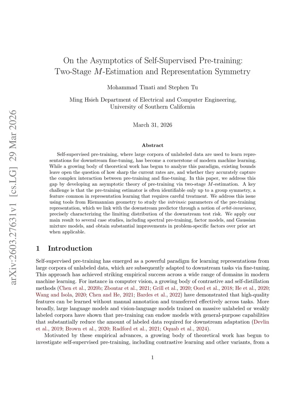 On the Asymptotics of Self-Supervised Pre-training: Two-Stage M-Estimation and Representation Symmetry