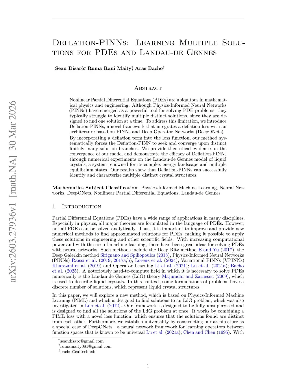 Nonlinear Partial Differential Equations (PDEs) are ubiquitous in mathematical physics and engineering. Although Physics-Informed Neural Networks (PINNs) have emerged as a powerful tool for solving PDE problems, they typically struggle to identify multiple distinct solutions, since they are designed to find one solution at a time. To address this limitation, we introduce Deflation-PINNs, a novel framework that integrates a deflation loss with an architecture based on PINNs and Deep Operator Networks (DeepONets). By incorporating a deflation term into the loss function, our method systematically forces the Deflation-PINN to seek and converge upon distinct finitely many solution branches. We provide theoretical evidence on the convergence of our model and demonstrate the efficacy of Deflation-PINNs through numerical experiments on the Landau-de Gennes model of liquid crystals, a system renowned for its complex energy landscape and multiple equilibrium states. Our results show that Deflation-PINNs can successfully identify and characterize multiple distinct crystal structures.
