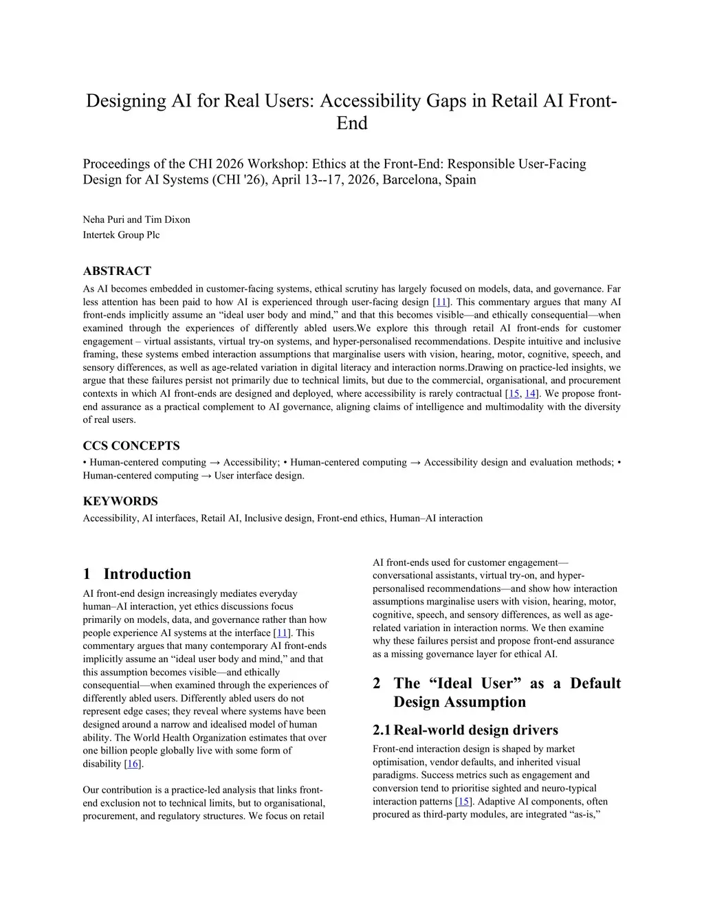 As AI becomes embedded in customer-facing systems, ethical scrutiny has largely focused on models, data, and governance. Far less attention has been paid to how AI is experienced through user-facing design. This commentary argues that many AI front-ends implicitly assume an ídeal user body and mind', and that this becomes visible and ethically consequential when examined through the experiences of differently abled users. We explore this through retail AI front-ends for customer engagement - i.e., virtual assistants, virtual try-on systems, and hyper-personalised recommendations. Despite intuitive and inclusive framing, these systems embed interaction assumptions that marginalise users with vision, hearing, motor, cognitive, speech and sensory differences, as well as age-related variation in digital literacy and interaction norms. Drawing on practice-led insights, we argue that these failures persist not primarily due to technical limits, but due to the commercial, organisational, and procurement contexts in which AI front-ends are designed and deployed, where accessibility is rarely contractual. We propose front-end assurance as a practical complement to AI governance, aligning claims of intelligence and multimodality with the diversity of real users.