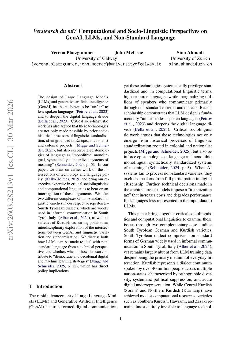 The design of Large Language Models and generative artificial intelligence has been shown to be "unfair" to less-spoken languages and to deepen the digital language divide. Critical sociolinguistic work has also argued that these technologies are not only made possible by prior socio-historical processes of linguistic standardisation, often grounded in European nationalist and colonial projects, but also exacerbate epistemologies of language as "monolithic, monolingual, syntactically standardized systems of meaning". In our paper, we draw on earlier work on the intersections of technology and language policy and bring our respective expertise in critical sociolinguistics and computational linguistics to bear on an interrogation of these arguments. We take two different complexes of non-standard linguistic varieties in our respective repertoires--South Tyrolean dialects, which are widely used in informal communication in South Tyrol, Italy, as well as varieties of Kurdish--as starting points to an interdisciplinary exploration of the intersections between GenAI and linguistic variation and standardisation. We discuss both how LLMs can be made to deal with nonstandard language from a technical perspective, and whether, when or how this can contribute to "democratic and decolonial digital and machine learning strategies", which has direct policy implications.