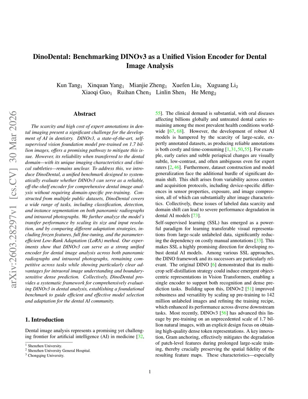 The scarcity and high cost of expert annotations in dental imaging present a significant challenge for the development of AI in dentistry. DINOv3, a state-of-the-art, self-supervised vision foundation model pre-trained on 1.7 billion images, offers a promising pathway to mitigate this issue. However, its reliability when transferred to the dental domain, with its unique imaging characteristics and clinical subtleties, remains unclear. To address this, we introduce DinoDental, a unified benchmark designed to systematically evaluate whether DINOv3 can serve as a reliable, off-the-shelf encoder for comprehensive dental image analysis without requiring domain-specific pre-training. Constructed from multiple public datasets, DinoDental covers a wide range of tasks, including classification, detection, and instance segmentation on both panoramic radiographs and intraoral photographs. We further analyze the model's transfer performance by scaling its size and input resolution, and by comparing different adaptation strategies, including frozen features, full fine-tuning, and the parameter-efficient Low-Rank Adaptation (LoRA) method. Our experiments show that DINOv3 can serve as a strong unified encoder for dental image analysis across both panoramic radiographs and intraoral photographs, remaining competitive across tasks while showing particularly clear advantages for intraoral image understanding and boundary-sensitive dense prediction. Collectively, DinoDental provides a systematic framework for comprehensively evaluating DINOv3 in dental analysis, establishing a foundational benchmark to guide efficient and effective model selection and adaptation for the dental AI community.