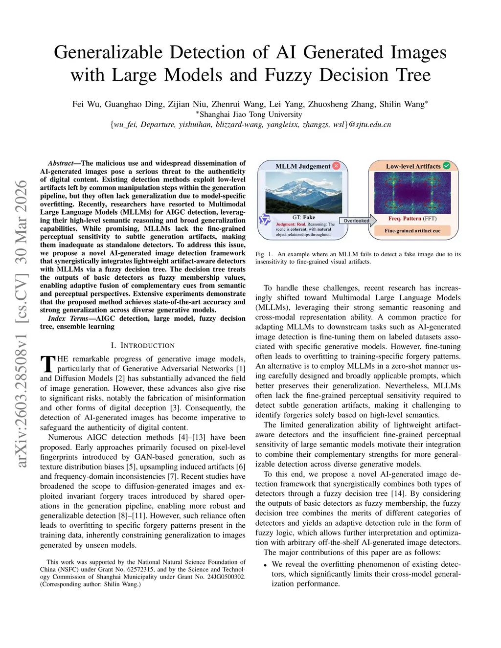 The malicious use and widespread dissemination of AI-generated images pose a serious threat to the authenticity of digital content. Existing detection methods exploit low-level artifacts left by common manipulation steps within the generation pipeline, but they often lack generalization due to model-specific overfitting. Recently, researchers have resorted to Multimodal Large Language Models (MLLMs) for AIGC detection, leveraging their high-level semantic reasoning and broad generalization capabilities. While promising, MLLMs lack the fine-grained perceptual sensitivity to subtle generation artifacts, making them inadequate as standalone detectors. To address this issue, we propose a novel AI-generated image detection framework that synergistically integrates lightweight artifact-aware detectors with MLLMs via a fuzzy decision tree. The decision tree treats the outputs of basic detectors as fuzzy membership values, enabling adaptive fusion of complementary cues from semantic and perceptual perspectives. Extensive experiments demonstrate that the proposed method achieves state-of-the-art accuracy and strong generalization across diverse generative models.