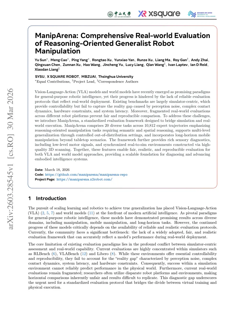 Vision-Language-Action (VLA) models and world models have recently emerged as promising paradigms for general-purpose robotic intelligence, yet their progress is hindered by the lack of reliable evaluation protocols that reflect real-world deployment. Existing benchmarks are largely simulator-centric, which provide controllability but fail to capture the reality gap caused by perception noise, complex contact dynamics, hardware constraints, and system latency. Moreover, fragmented real-world evaluations across different robot platforms prevent fair and reproducible comparison. To address these challenges, we introduce ManipArena, a standardized evaluation framework designed to bridge simulation and real-world execution. ManipArena comprises 20 diverse tasks across 10,812 expert trajectories emphasizing reasoning-oriented manipulation tasks requiring semantic and spatial reasoning, supports multi-level generalization through controlled out-of-distribution settings, and incorporates long-horizon mobile manipulation beyond tabletop scenarios. The framework further provides rich sensory diagnostics, including low-level motor signals, and synchronized real-to-sim environments constructed via high-quality 3D scanning. Together, these features enable fair, realistic, and reproducible evaluation for both VLA and world model approaches, providing a scalable foundation for diagnosing and advancing embodied intelligence systems.