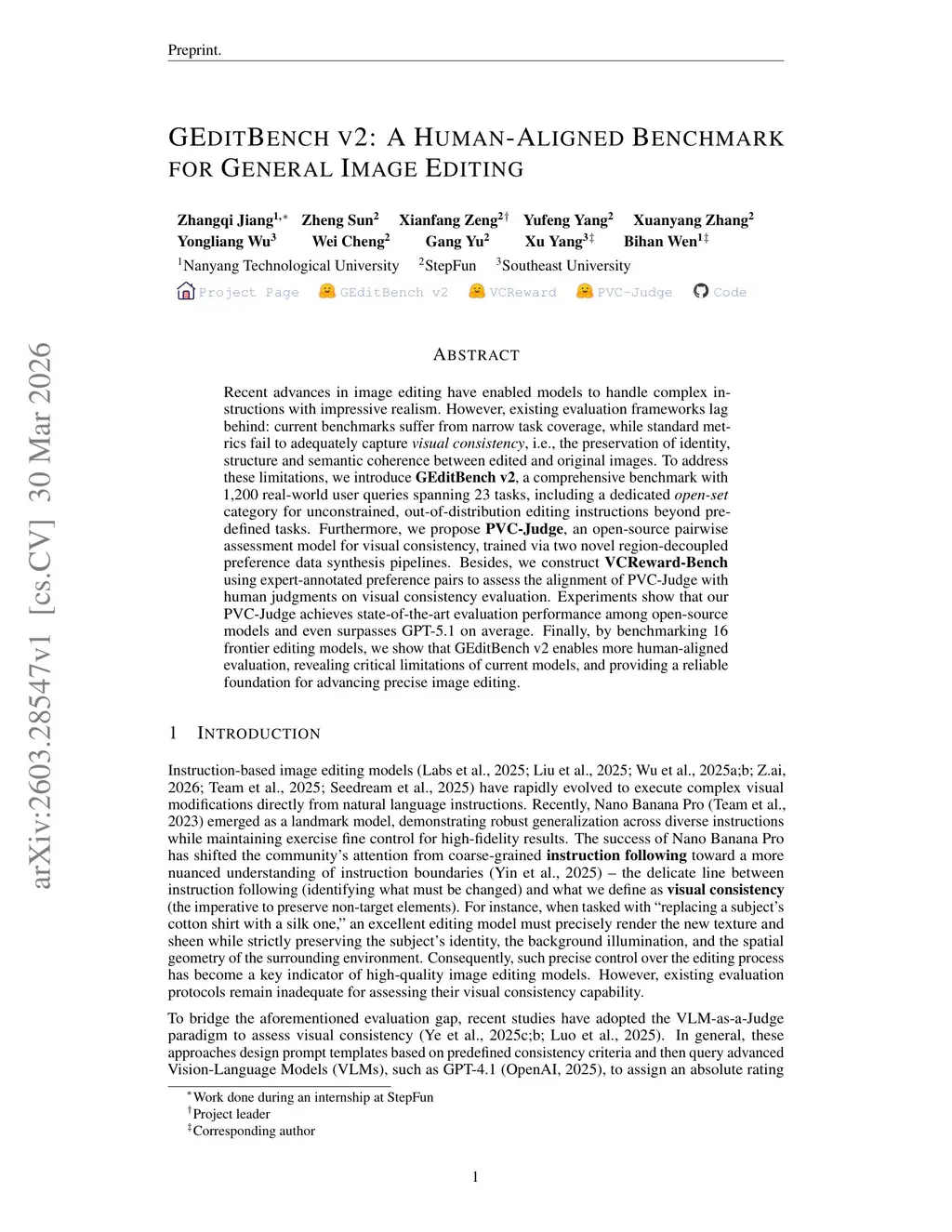 Recent advances in image editing have enabled models to handle complex instructions with impressive realism. However, existing evaluation frameworks lag behind: current benchmarks suffer from narrow task coverage, while standard metrics fail to adequately capture visual consistency, i.e., the preservation of identity, structure and semantic coherence between edited and original images. To address these limitations, we introduce GEditBench v2, a comprehensive benchmark with 1,200 real-world user queries spanning 23 tasks, including a dedicated open-set category for unconstrained, out-of-distribution editing instructions beyond predefined tasks. Furthermore, we propose PVC-Judge, an open-source pairwise assessment model for visual consistency, trained via two novel region-decoupled preference data synthesis pipelines. Besides, we construct VCReward-Bench using expert-annotated preference pairs to assess the alignment of PVC-Judge with human judgments on visual consistency evaluation. Experiments show that our PVC-Judge achieves state-of-the-art evaluation performance among open-source models and even surpasses GPT-5.1 on average. Finally, by benchmarking 16 frontier editing models, we show that GEditBench v2 enables more human-aligned evaluation, revealing critical limitations of current models, and providing a reliable foundation for advancing precise image editing.