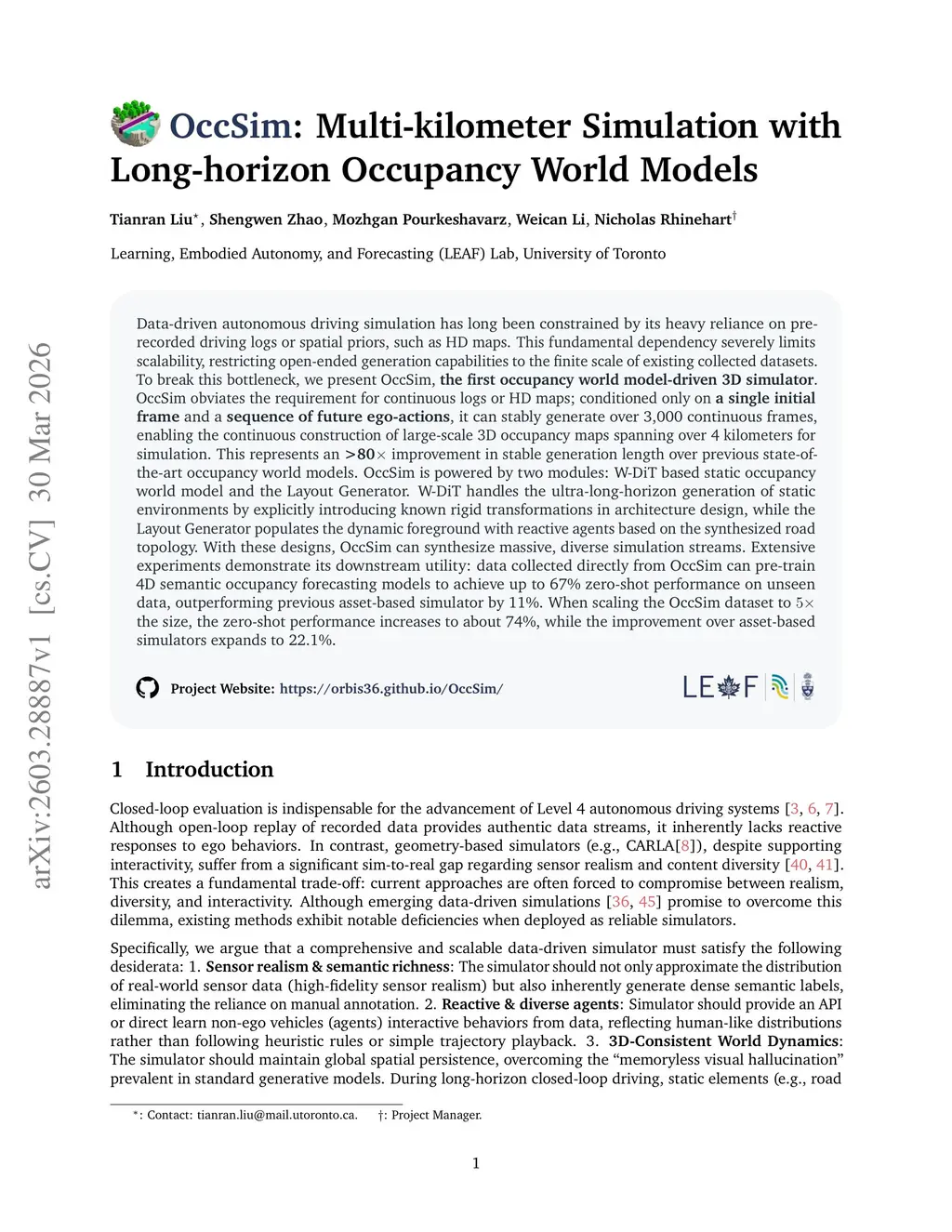Data-driven autonomous driving simulation has long been constrained by its heavy reliance on pre-recorded driving logs or spatial priors, such as HD maps. This fundamental dependency severely limits scalability, restricting open-ended generation capabilities to the finite scale of existing collected datasets. To break this bottleneck, we present OccSim, the first occupancy world model-driven 3D simulator. OccSim obviates the requirement for continuous logs or HD maps; conditioned only on a single initial frame and a sequence of future ego-actions, it can stably generate over 3,000 continuous frames, enabling the continuous construction of large-scale 3D occupancy maps spanning over 4 kilometers for simulation. This represents an >80x improvement in stable generation length over previous state-of-the-art occupancy world models. OccSim is powered by two modules: W-DiT based static occupancy world model and the Layout Generator. W-DiT handles the ultra-long-horizon generation of static environments by explicitly introducing known rigid transformations in architecture design, while the Layout Generator populates the dynamic foreground with reactive agents based on the synthesized road topology. With these designs, OccSim can synthesize massive, diverse simulation streams. Extensive experiments demonstrate its downstream utility: data collected directly from OccSim can pre-train 4D semantic occupancy forecasting models to achieve up to 67% zero-shot performance on unseen data, outperforming previous asset-based simulator by 11%. When scaling the OccSim dataset to 5x the size, the zero-shot performance increases to about 74%, while the improvement over asset-based simulators expands to 22.1%.