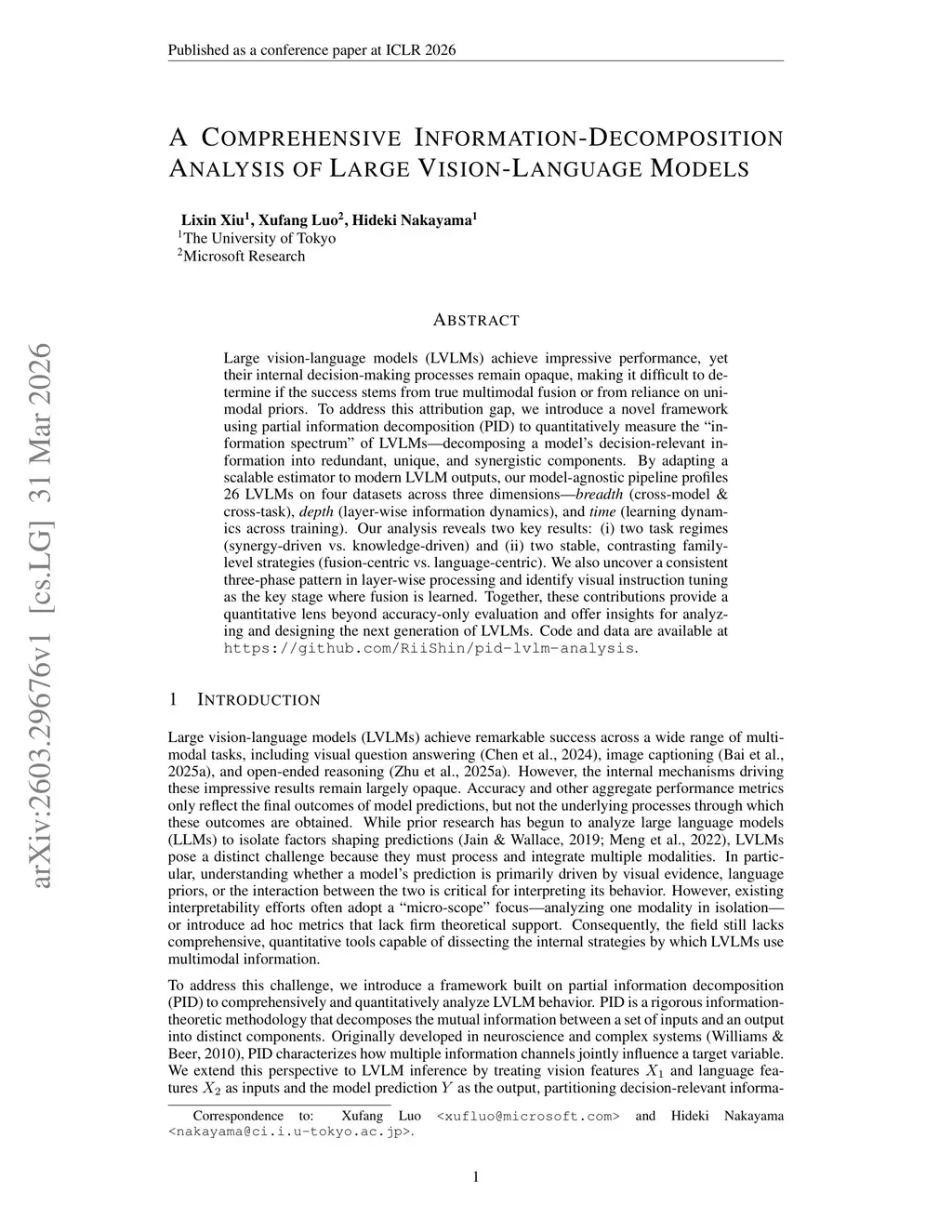 Large vision-language models (LVLMs) achieve impressive performance, yet their internal decision-making processes remain opaque, making it difficult to determine if the success stems from true multimodal fusion or from reliance on unimodal priors. To address this attribution gap, we introduce a novel framework using partial information decomposition (PID) to quantitatively measure the "information spectrum" of LVLMs -- decomposing a model's decision-relevant information into redundant, unique, and synergistic components. By adapting a scalable estimator to modern LVLM outputs, our model-agnostic pipeline profiles 26 LVLMs on four datasets across three dimensions -- breadth (cross-model & cross-task), depth (layer-wise information dynamics), and time (learning dynamics across training). Our analysis reveals two key results: (i) two task regimes (synergy-driven vs. knowledge-driven) and (ii) two stable, contrasting family-level strategies (fusion-centric vs. language-centric). We also uncover a consistent three-phase pattern in layer-wise processing and identify visual instruction tuning as the key stage where fusion is learned. Together, these contributions provide a quantitative lens beyond accuracy-only evaluation and offer insights for analyzing and designing the next generation of LVLMs. Code and data are available atthis https URL.
