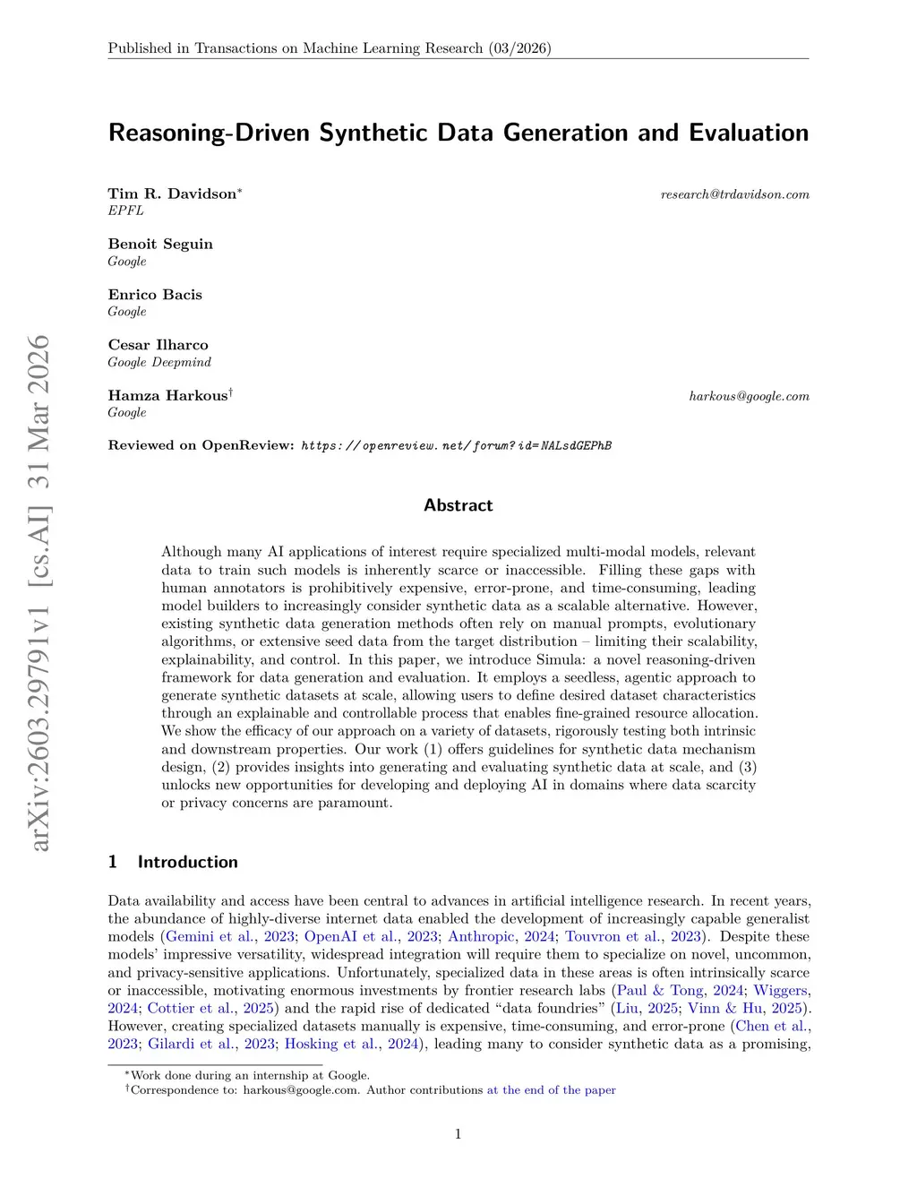 Although many AI applications of interest require specialized multi-modal models, relevant data to train such models is inherently scarce or inaccessible. Filling these gaps with human annotators is prohibitively expensive, error-prone, and time-consuming, leading model builders to increasingly consider synthetic data as a scalable alternative. However, existing synthetic data generation methods often rely on manual prompts, evolutionary algorithms, or extensive seed data from the target distribution - limiting their scalability, explainability, and control. In this paper, we introduce Simula: a novel reasoning-driven framework for data generation and evaluation. It employs a seedless, agentic approach to generate synthetic datasets at scale, allowing users to define desired dataset characteristics through an explainable and controllable process that enables fine-grained resource allocation. We show the efficacy of our approach on a variety of datasets, rigorously testing both intrinsic and downstream properties. Our work (1) offers guidelines for synthetic data mechanism design, (2) provides insights into generating and evaluating synthetic data at scale, and (3) unlocks new opportunities for developing and deploying AI in domains where data scarcity or privacy concerns are paramount.