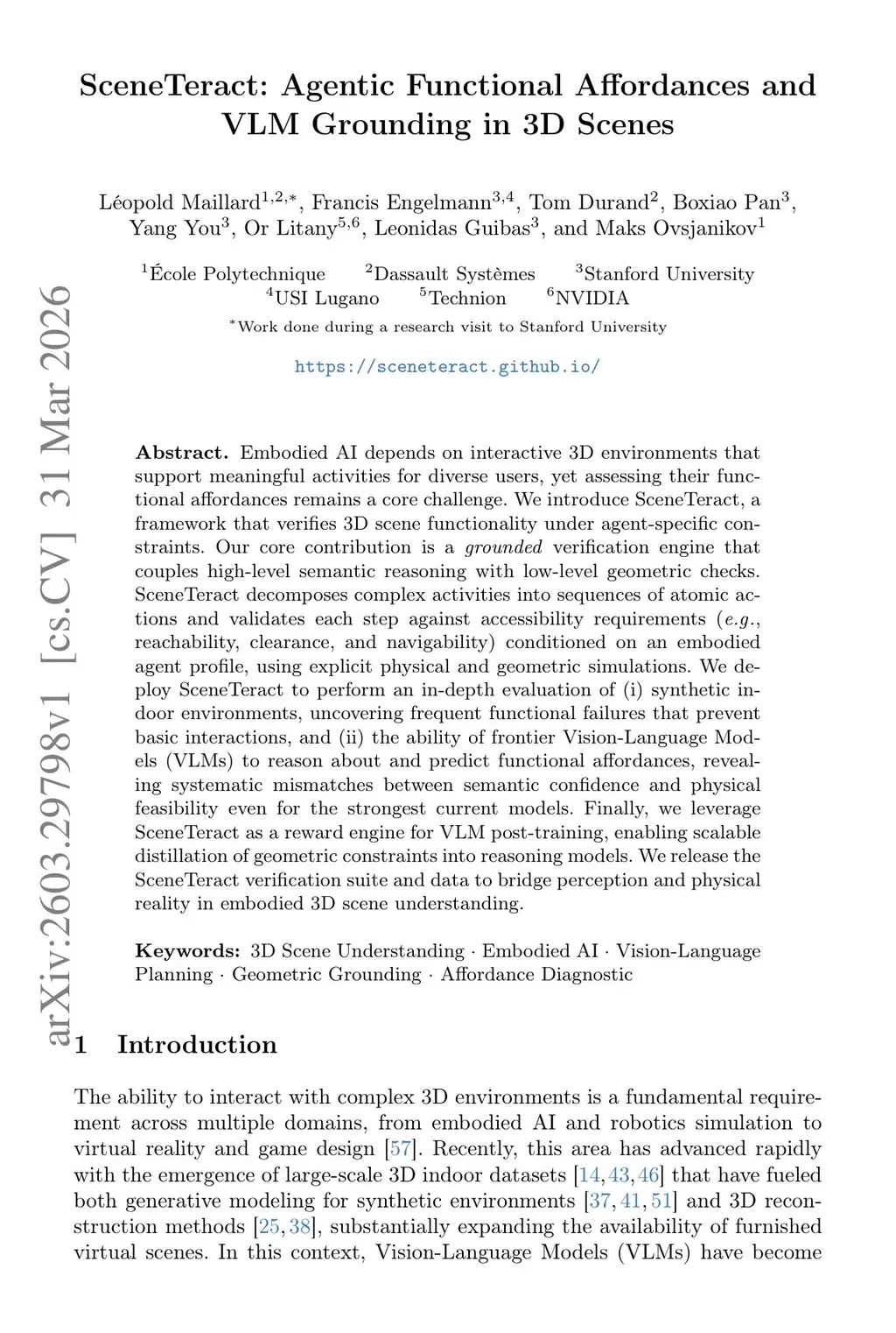 Embodied AI depends on interactive 3D environments that support meaningful activities for diverse users, yet assessing their functional affordances remains a core challenge. We introduce SceneTeract, a framework that verifies 3D scene functionality under agent-specific constraints. Our core contribution is a grounded verification engine that couples high-level semantic reasoning with low-level geometric checks. SceneTeract decomposes complex activities into sequences of atomic actions and validates each step against accessibility requirements (e.g., reachability, clearance, and navigability) conditioned on an embodied agent profile, using explicit physical and geometric simulations. We deploy SceneTeract to perform an in-depth evaluation of (i) synthetic indoor environments, uncovering frequent functional failures that prevent basic interactions, and (ii) the ability of frontier Vision-Language Models (VLMs) to reason about and predict functional affordances, revealing systematic mismatches between semantic confidence and physical feasibility even for the strongest current models. Finally, we leverage SceneTeract as a reward engine for VLM post-training, enabling scalable distillation of geometric constraints into reasoning models. We release the SceneTeract verification suite and data to bridge perception and physical reality in embodied 3D scene understanding.