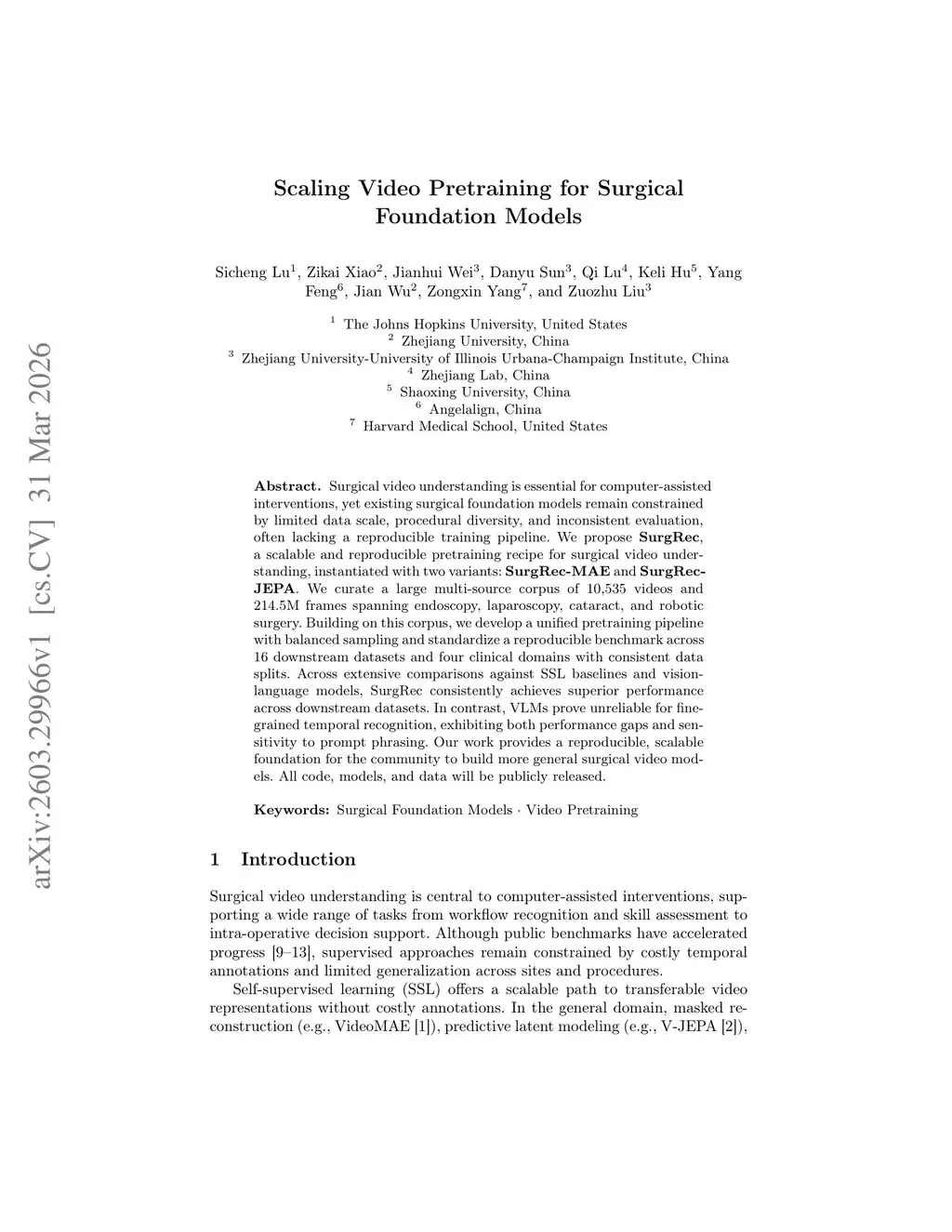 Surgical video understanding is essential for computer-assisted interventions, yet existing surgical foundation models remain constrained by limited data scale, procedural diversity, and inconsistent evaluation, often lacking a reproducible training pipeline. We propose SurgRec, a scalable and reproducible pretraining recipe for surgical video understanding, instantiated with two variants: SurgRec-MAE and SurgRec-JEPA. We curate a large multi-source corpus of 10,535 videos and 214.5M frames spanning endoscopy, laparoscopy, cataract, and robotic surgery. Building on this corpus, we develop a unified pretraining pipeline with balanced sampling and standardize a reproducible benchmark across 16 downstream datasets and four clinical domains with consistent data splits. Across extensive comparisons against SSL baselines and vision-language models, SurgRec consistently achieves superior performance across downstream datasets. In contrast, VLMs prove unreliable for fine-grained temporal recognition, exhibiting both performance gaps and sensitivity to prompt phrasing. Our work provides a reproducible, scalable foundation for the community to build more general surgical video models. All code, models, and data will be publicly released.