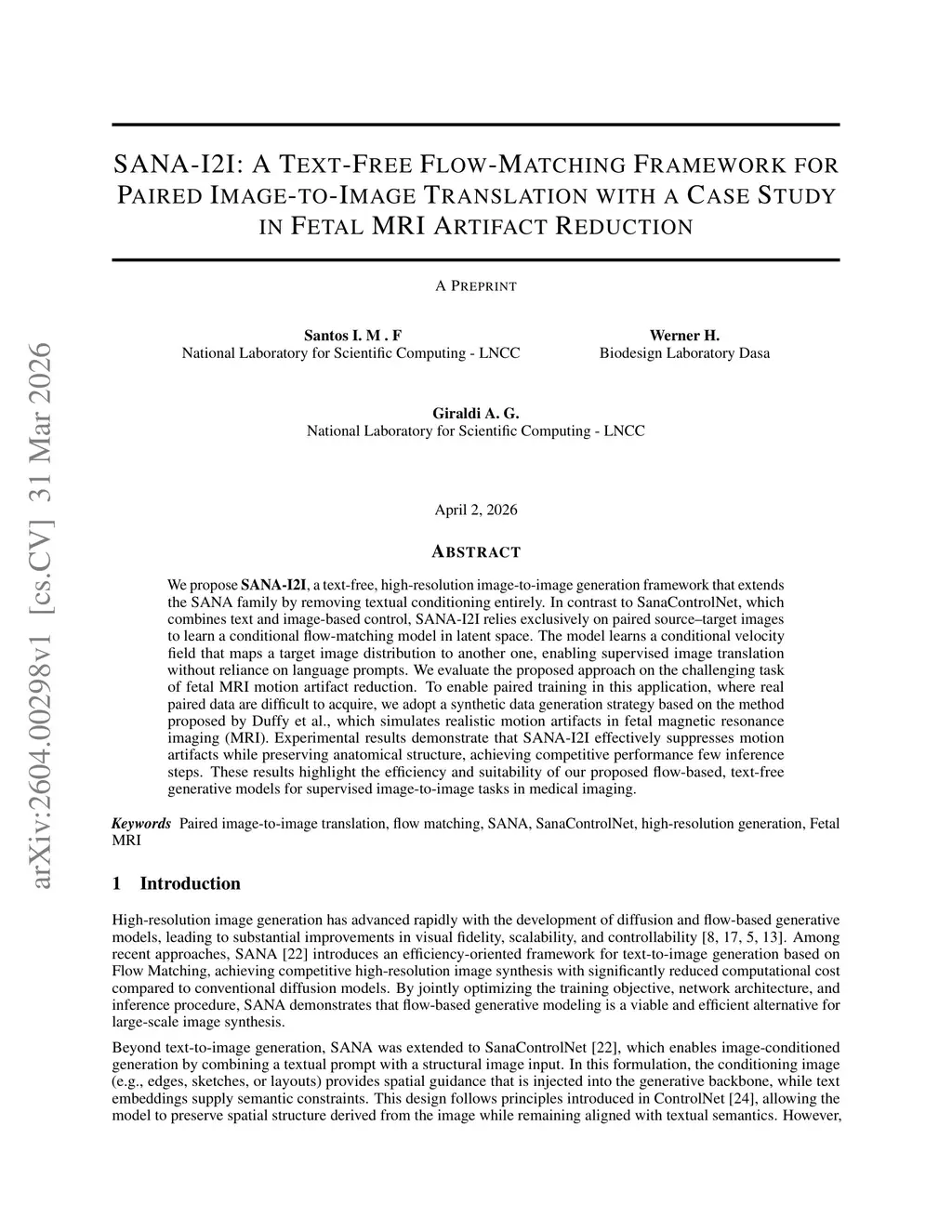 We propose SANA-I2I, a text-free high-resolution image-to-image generation framework that extends the SANA family by removing textual conditioning entirely. In contrast to SanaControlNet, which combines text and image-based control, SANA-I2I relies exclusively on paired source-target images to learn a conditional flow-matching model in latent space. The model learns a conditional velocity field that maps a target image distribution to another one, enabling supervised image translation without reliance on language prompts. We evaluate the proposed approach on the challenging task of fetal MRI motion artifact reduction. To enable paired training in this application, where real paired data are difficult to acquire, we adopt a synthetic data generation strategy based on the method proposed by Duffy et al., which simulates realistic motion artifacts in fetal magnetic resonance imaging (MRI). Experimental results demonstrate that SANA-I2I effectively suppresses motion artifacts while preserving anatomical structure, achieving competitive performance few inference steps. These results highlight the efficiency and suitability of our proposed flow-based, text-free generative models for supervised image-to-image tasks in medical imaging.