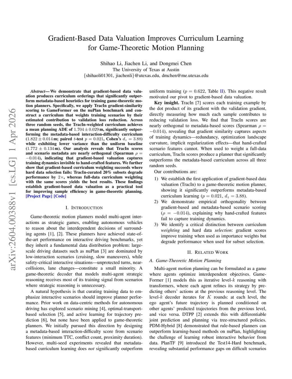 Gradient-Based Data Valuation Improves Curriculum Learning for Game-Theoretic Motion Planning