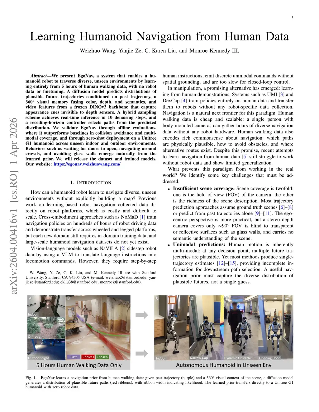 We present EgoNav, a system that enables a humanoid robot to traverse diverse, unseen environments by learning entirely from 5 hours of human walking data, with no robot data or finetuning. A diffusion model predicts distributions of plausible future trajectories conditioned on past trajectory, a 360 deg visual memory fusing color, depth, and semantics, and video features from a frozen DINOv3 backbone that capture appearance cues invisible to depth sensors. A hybrid sampling scheme achieves real-time inference in 10 denoising steps, and a receding-horizon controller selects paths from the predicted distribution. We validate EgoNav through offline evaluations, where it outperforms baselines in collision avoidance and multi-modal coverage, and through zero-shot deployment on a Unitree G1 humanoid across unseen indoor and outdoor environments. Behaviors such as waiting for doors to open, navigating around crowds, and avoiding glass walls emerge naturally from the learned prior. We will release the dataset and trained models. Our website:this https URL