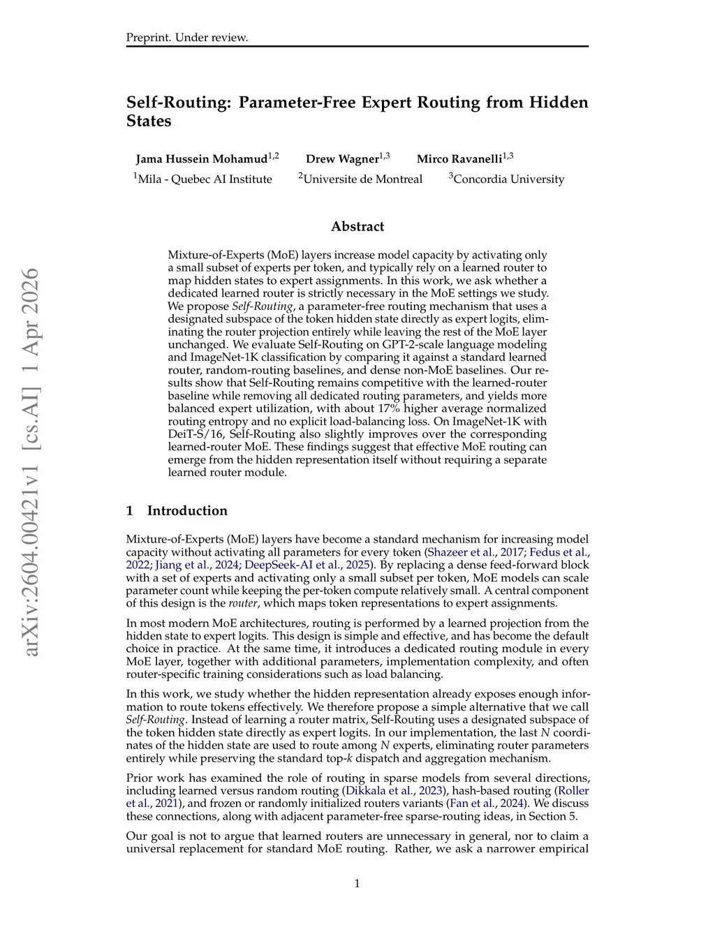 Mixture-of-Experts (MoE) layers increase model capacity by activating only a small subset of experts per token, and typically rely on a learned router to map hidden states to expert assignments. In this work, we ask whether a dedicated learned router is strictly necessary in the MoE settings we study. We propose Self-Routing, a parameter-free routing mechanism that uses a designated subspace of the token hidden state directly as expert logits, eliminating the router projection entirely while leaving the rest of the MoE layer unchanged. We evaluate Self-Routing on GPT-2-scale language modeling and ImageNet-1K classification by comparing it against a standard learned router, random-routing baselines, and dense non-MoE baselines. Our results show that Self-Routing remains competitive with the learned-router baseline while removing all dedicated routing parameters, and yields more balanced expert utilization, with about 17 % higher average normalized routing entropy and no explicit load-balancing loss. On ImageNet-1K with DeiT-S/16, Self-Routing also slightly improves over the corresponding learned-router MoE. These findings suggest that effective MoE routing can emerge from the hidden representation itself without requiring a separate learned router module.