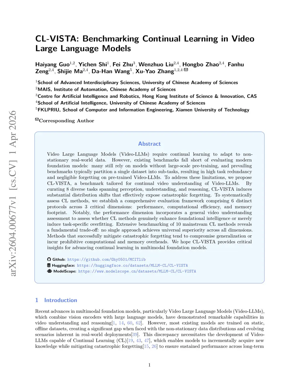 Video Large Language Models (Video-LLMs) require continual learning to adapt to non-stationary real-world data. However, existing benchmarks fall short of evaluating modern foundation models: many still rely on models without large-scale pre-training, and prevailing benchmarks typically partition a single dataset into sub-tasks, resulting in high task redundancy and negligible forgetting on pre-trained Video-LLMs. To address these limitations, we propose CL-VISTA, a benchmark tailored for continual video understanding of Video-LLMs. By curating 8 diverse tasks spanning perception, understanding, and reasoning, CL-VISTA induces substantial distribution shifts that effectively expose catastrophic forgetting. To systematically assess CL methods, we establish a comprehensive evaluation framework comprising 6 distinct protocols across 3 critical dimensions: performance, computational efficiency, and memory footprint. Notably, the performance dimension incorporates a general video understanding assessment to assess whether CL methods genuinely enhance foundational intelligence or merely induce task-specific overfitting. Extensive benchmarking of 10 mainstream CL methods reveals a fundamental trade-off: no single approach achieves universal superiority across all dimensions. Methods that successfully mitigate catastrophic forgetting tend to compromise generalization or incur prohibitive computational and memory overheads. We hope CL-VISTA provides critical insights for advancing continual learning in multimodal foundation models.