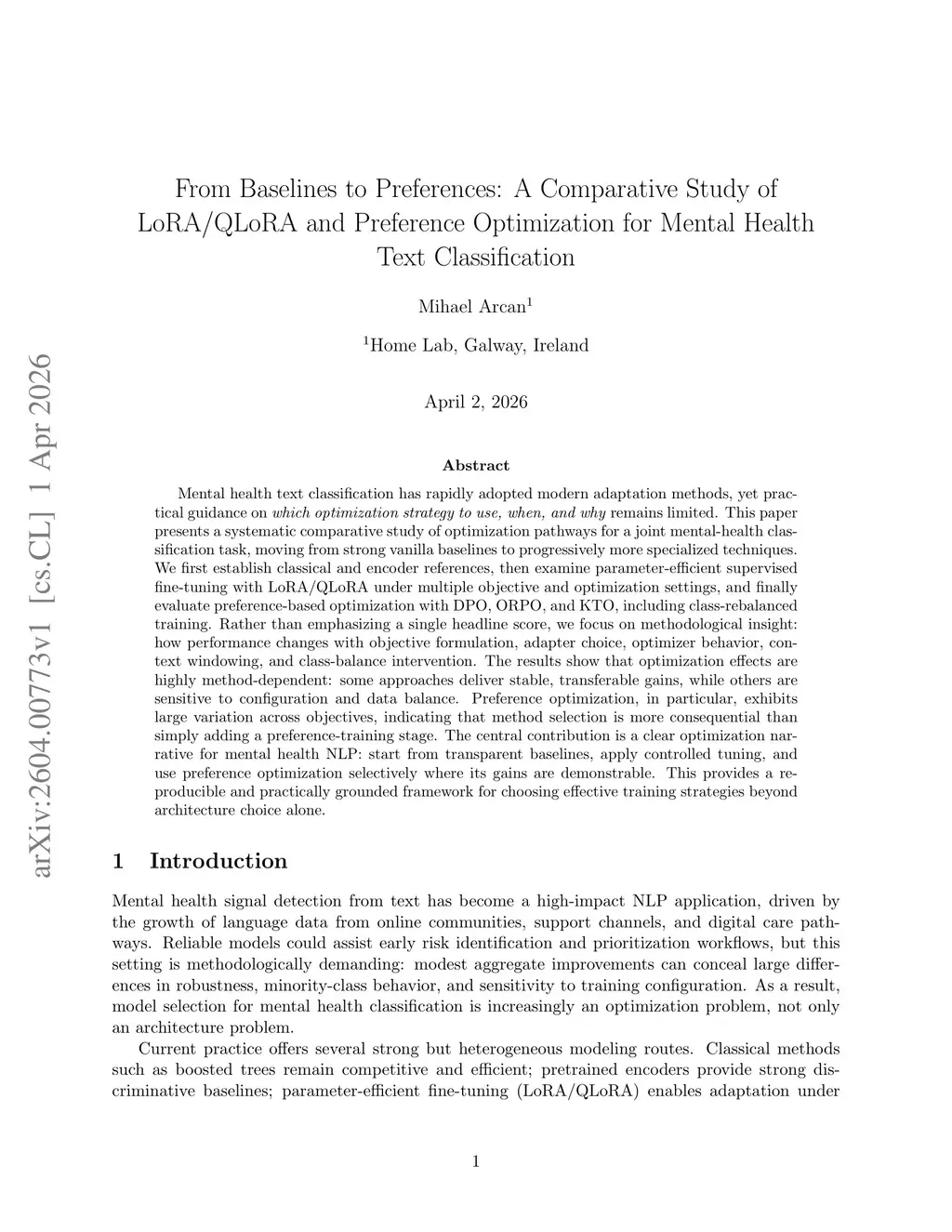 Mental health text classification has rapidly adopted modern adaptation methods, yet practical guidance on which optimization strategy to use, when, and why remains limited. This paper presents a systematic comparative study of optimization pathways for a joint mental-health classification task, moving from strong vanilla baselines to progressively more specialized techniques. We first establish classical and encoder references, then examine parameter-efficient supervised fine-tuning with LoRA/QLoRA under multiple objective and optimization settings, and finally evaluate preference-based optimization with DPO, ORPO, and KTO, including class-rebalanced training. Rather than emphasizing a single headline score, we focus on methodological insight: how performance changes with objective formulation, adapter choice, optimizer behavior, context windowing, and class-balance intervention. The results show that optimization effects are highly method-dependent: some approaches deliver stable, transferable gains, while others are sensitive to configuration and data balance. Preference optimization, in particular, exhibits large variation across objectives, indicating that method selection is more consequential than simply adding a preference-training stage. The central contribution is a clear optimization narrative for mental health NLP: start from transparent baselines, apply controlled tuning, and use preference optimization selectively where its gains are demonstrable. This provides a reproducible and practically grounded framework for choosing effective training strategies beyond architecture choice alone.