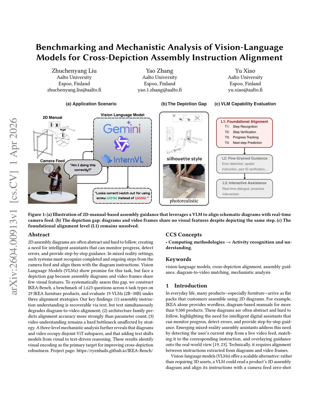 2D assembly diagrams are often abstract and hard to follow, creating a need for intelligent assistants that can monitor progress, detect errors, and provide step-by-step guidance. In mixed reality settings, such systems must recognize completed and ongoing steps from the camera feed and align them with the diagram instructions. Vision Language Models (VLMs) show promise for this task, but face a depiction gap because assembly diagrams and video frames share few visual features. To systematically assess this gap, we construct IKEA-Bench, a benchmark of 1,623 questions across 6 task types on 29 IKEA furniture products, and evaluate 19 VLMs (2B-38B) under three alignment strategies. Our key findings: (1) assembly instruction understanding is recoverable via text, but text simultaneously degrades diagram-to-video alignment; (2) architecture family predicts alignment accuracy more strongly than parameter count; (3) video understanding remains a hard bottleneck unaffected by strategy. A three-level mechanistic analysis further reveals that diagrams and video occupy disjoint ViT subspaces, and that adding text shifts models from visual to text-driven reasoning. These results identify visual encoding as the primary target for improving cross-depiction robustness. Project page:this https URL