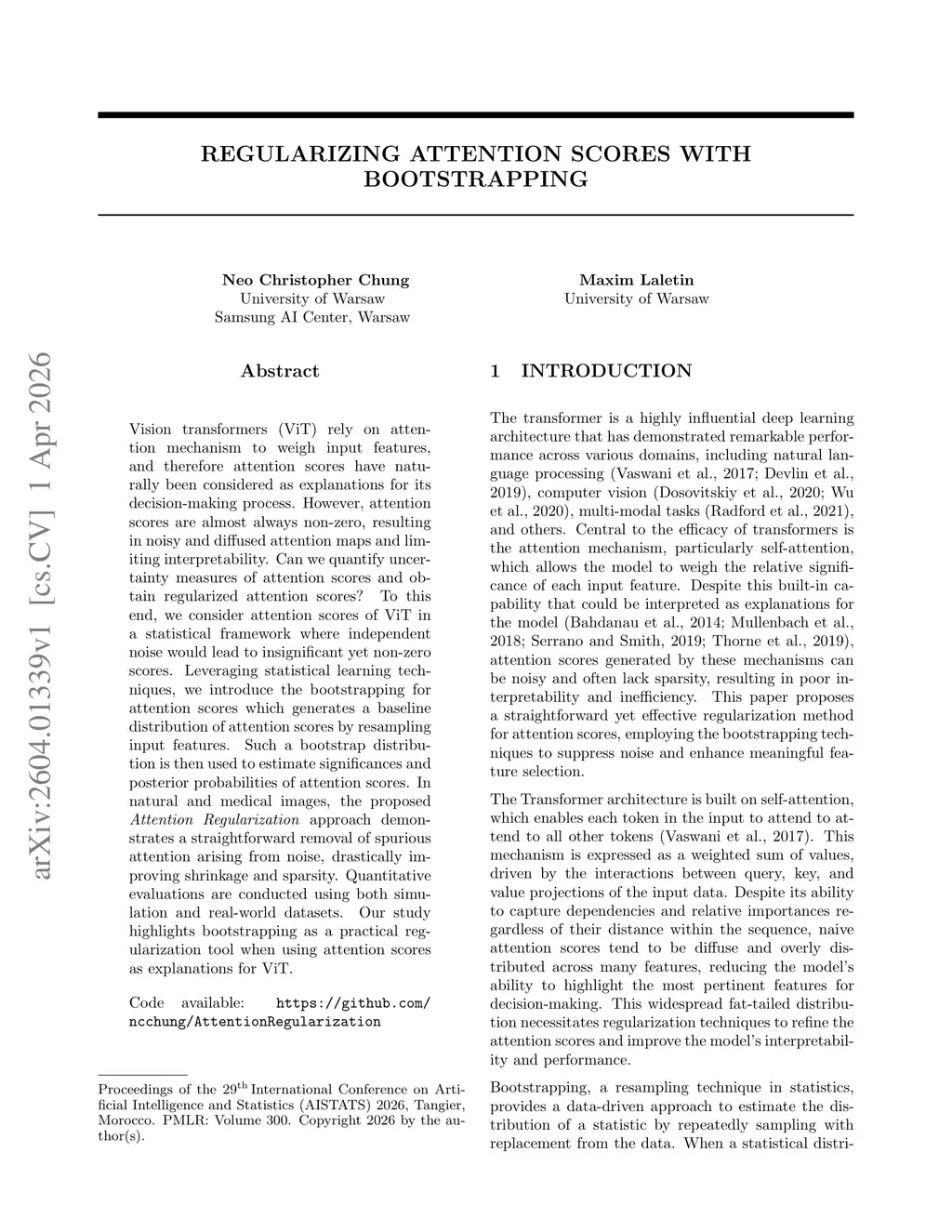 Vision transformers (ViT) rely on attention mechanism to weigh input features, and therefore attention scores have naturally been considered as explanations for its decision-making process. However, attention scores are almost always non-zero, resulting in noisy and diffused attention maps and limiting interpretability. Can we quantify uncertainty measures of attention scores and obtain regularized attention scores? To this end, we consider attention scores of ViT in a statistical framework where independent noise would lead to insignificant yet non-zero scores. Leveraging statistical learning techniques, we introduce the bootstrapping for attention scores which generates a baseline distribution of attention scores by resampling input features. Such a bootstrap distribution is then used to estimate significances and posterior probabilities of attention scores. In natural and medical images, the proposed \emph{Attention Regularization} approach demonstrates a straightforward removal of spurious attention arising from noise, drastically improving shrinkage and sparsity. Quantitative evaluations are conducted using both simulation and real-world datasets. Our study highlights bootstrapping as a practical regularization tool when using attention scores as explanations for ViT.Code available:this https URL