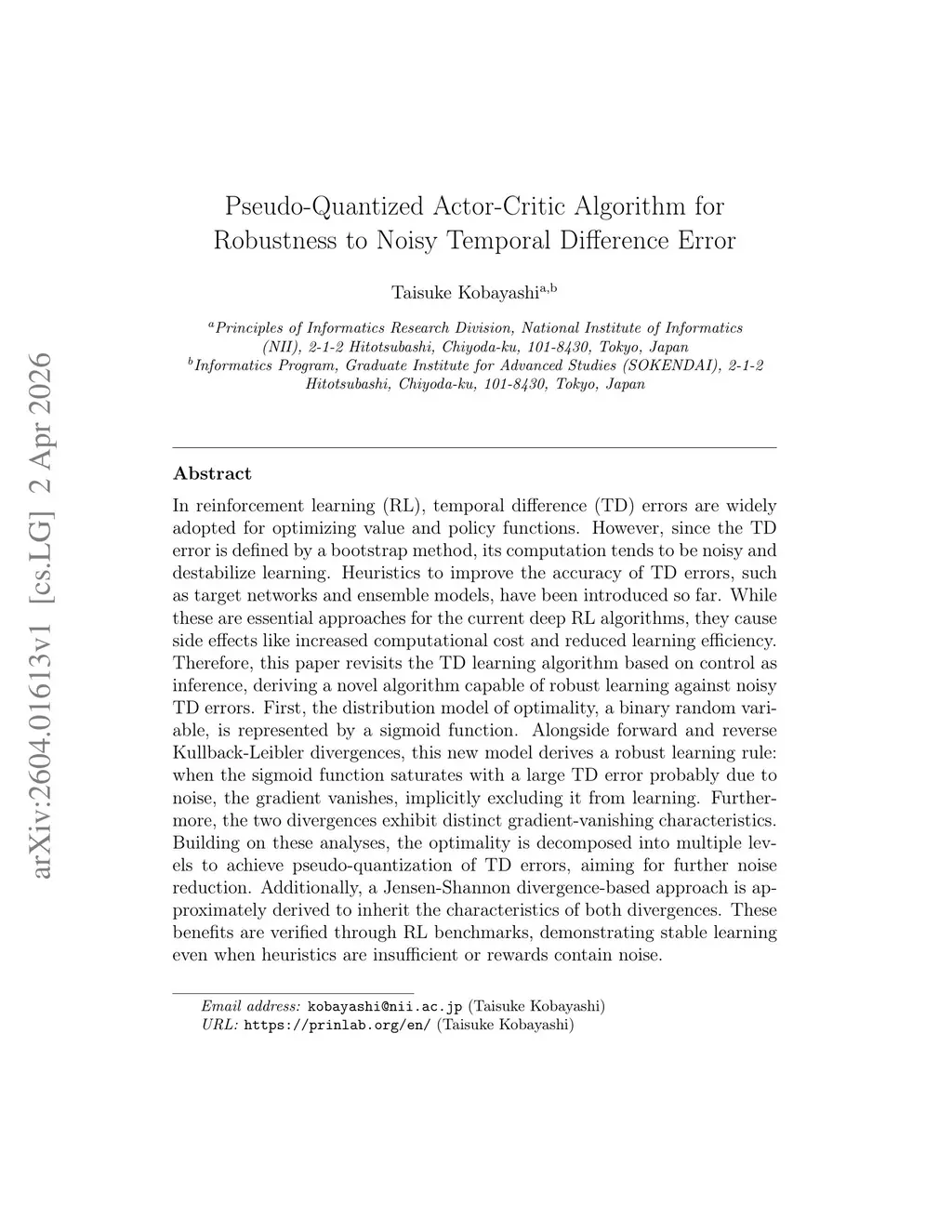 In reinforcement learning (RL), temporal difference (TD) errors are widely adopted for optimizing value and policy functions. However, since the TD error is defined by a bootstrap method, its computation tends to be noisy and destabilize learning. Heuristics to improve the accuracy of TD errors, such as target networks and ensemble models, have been introduced so far. While these are essential approaches for the current deep RL algorithms, they cause side effects like increased computational cost and reduced learning efficiency. Therefore, this paper revisits the TD learning algorithm based on control as inference, deriving a novel algorithm capable of robust learning against noisy TD errors. First, the distribution model of optimality, a binary random variable, is represented by a sigmoid function. Alongside forward and reverse Kullback-Leibler divergences, this new model derives a robust learning rule: when the sigmoid function saturates with a large TD error probably due to noise, the gradient vanishes, implicitly excluding it from learning. Furthermore, the two divergences exhibit distinct gradient-vanishing characteristics. Building on these analyses, the optimality is decomposed into multiple levels to achieve pseudo-quantization of TD errors, aiming for further noise reduction. Additionally, a Jensen-Shannon divergence-based approach is approximately derived to inherit the characteristics of both divergences. These benefits are verified through RL benchmarks, demonstrating stable learning even when heuristics are insufficient or rewards contain noise.