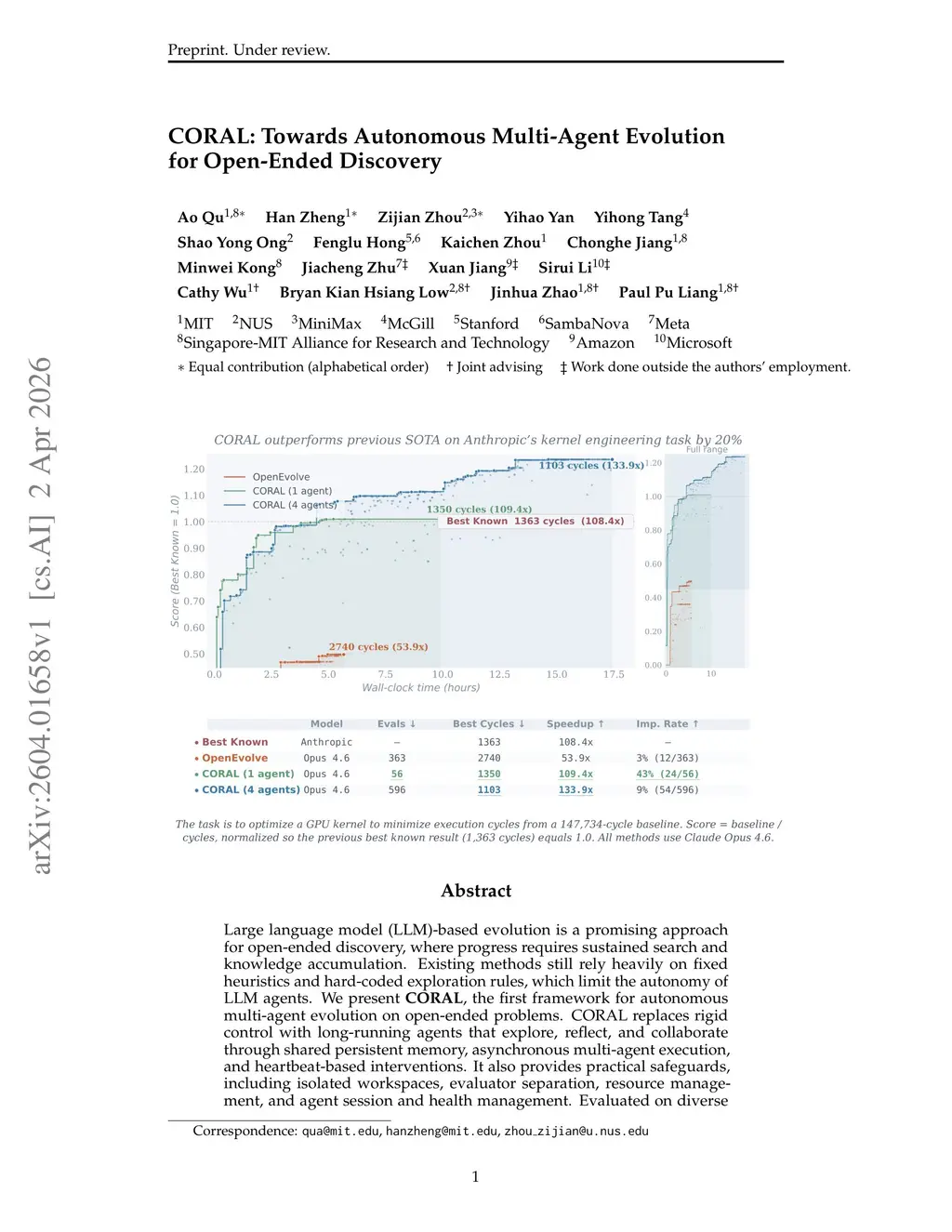 Large language model (LLM)-based evolution is a promising approach for open-ended discovery, where progress requires sustained search and knowledge accumulation. Existing methods still rely heavily on fixed heuristics and hard-coded exploration rules, which limit the autonomy of LLM agents. We present CORAL, the first framework for autonomous multi-agent evolution on open-ended problems. CORAL replaces rigid control with long-running agents that explore, reflect, and collaborate through shared persistent memory, asynchronous multi-agent execution, and heartbeat-based interventions. It also provides practical safeguards, including isolated workspaces, evaluator separation, resource management, and agent session and health management. Evaluated on diverse mathematical, algorithmic, and systems optimization tasks, CORAL sets new state-of-the-art results on 10 tasks, achieving 3-10 times higher improvement rates with far fewer evaluations than fixed evolutionary search baselines across tasks. On Anthropic's kernel engineering task, four co-evolving agents improve the best known score from 1363 to 1103 cycles. Mechanistic analyses further show how these gains arise from knowledge reuse and multi-agent exploration and communication. Together, these results suggest that greater agent autonomy and multi-agent evolution can substantially improve open-ended discovery. Code is available atthis https URL.