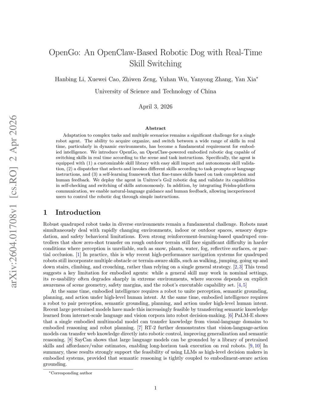 Adaptation to complex tasks and multiple scenarios remains a significant challenge for a single robot agent. The ability to acquire organize, and switch between a wide range of skills in real time, particularly in dynamic environments, has become a fundamental requirement for embodied intelligence. We introduce OpenGo, an OpenClaw-powered embodied robotic dog capable of switching skills in real time according to the scene and task instructions. Specifically, the agent is equipped with (1) a customizable skill library with easy skill import and autonomous skill validation, (2) a dispatcher that selects and invokes different skills according to task prompts or language instructions, and (3) a self-learning framework that fine-tunes skills based on task completion and human feedback. We deploy the agent in Unitree's Go2 robotic dog and validate its capabilities in self-checking and switching of skills autonomously. In addition, by integrating Feishu-platform communication, we enable natural-language guidance and human feedback, allowing inexperienced users to control the robotic dog through simple instructions.