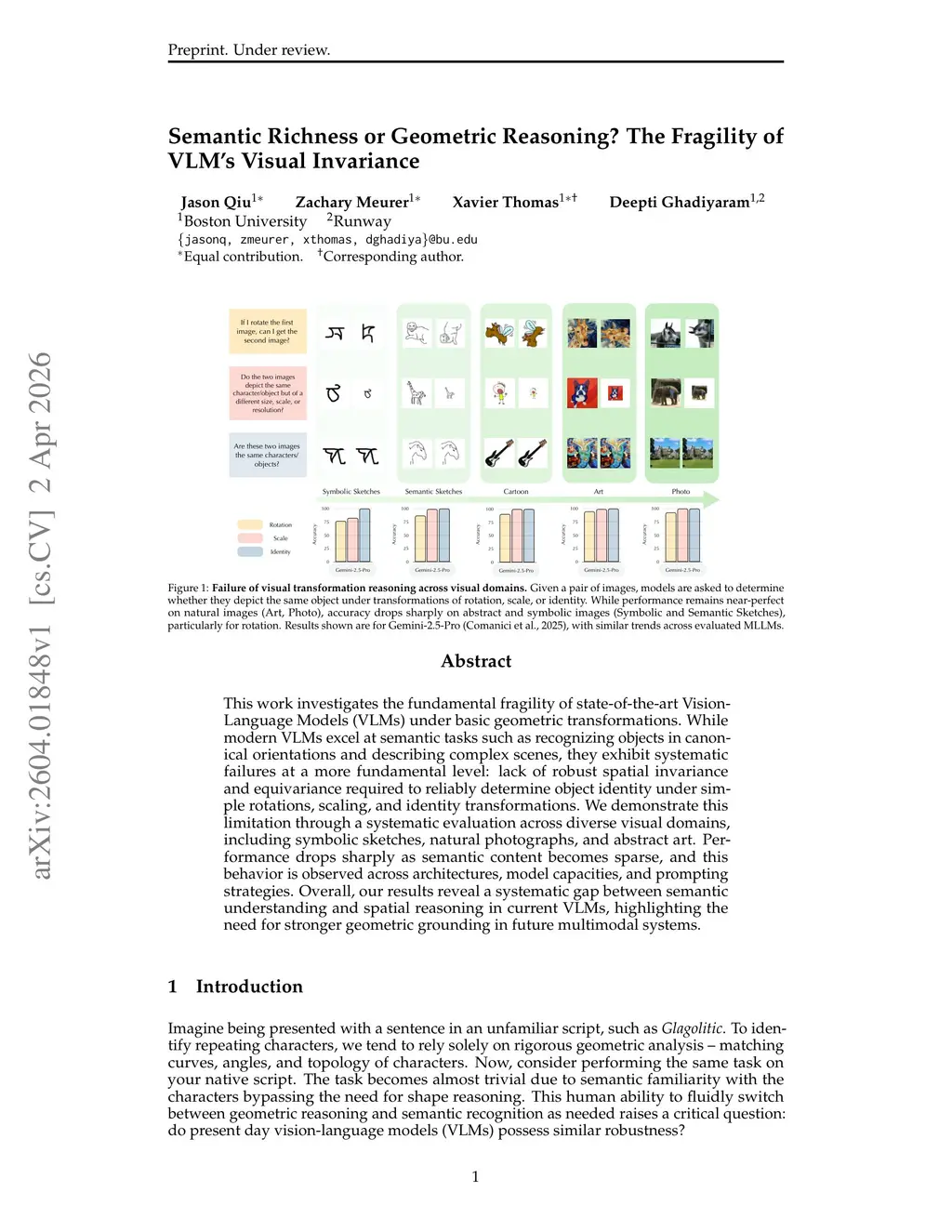 This work investigates the fundamental fragility of state-of-the-art Vision-Language Models (VLMs) under basic geometric transformations. While modern VLMs excel at semantic tasks such as recognizing objects in canonical orientations and describing complex scenes, they exhibit systematic failures at a more fundamental level: lack of robust spatial invariance and equivariance required to reliably determine object identity under simple rotations, scaling, and identity transformations. We demonstrate this limitation through a systematic evaluation across diverse visual domains, including symbolic sketches, natural photographs, and abstract art. Performance drops sharply as semantic content becomes sparse, and this behavior is observed across architectures, model capacities, and prompting strategies. Overall, our results reveal a systematic gap between semantic understanding and spatial reasoning in current VLMs, highlighting the need for stronger geometric grounding in future multimodal systems.