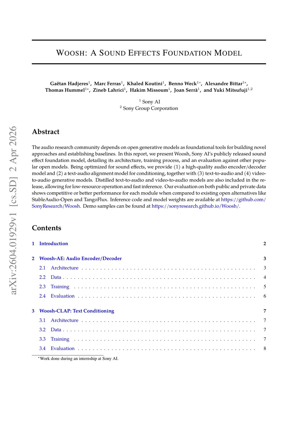 The audio research community depends on open generative models as foundational tools for building novel approaches and establishing baselines. In this report, we present Woosh, Sony AI's publicly released sound effect foundation model, detailing its architecture, training process, and an evaluation against other popular open models. Being optimized for sound effects, we provide (1) a high-quality audio encoder/decoder model and (2) a text-audio alignment model for conditioning, together with (3) text-to-audio and (4) video-to-audio generative models. Distilled text-to-audio and video-to-audio models are also included in the release, allowing for low-resource operation and fast inference. Our evaluation on both public and private data shows competitive or better performance for each module when compared to existing open alternatives like StableAudio-Open and TangoFlux. Inference code and model weights are available atthis https URL. Demo samples can be found atthis https URL.