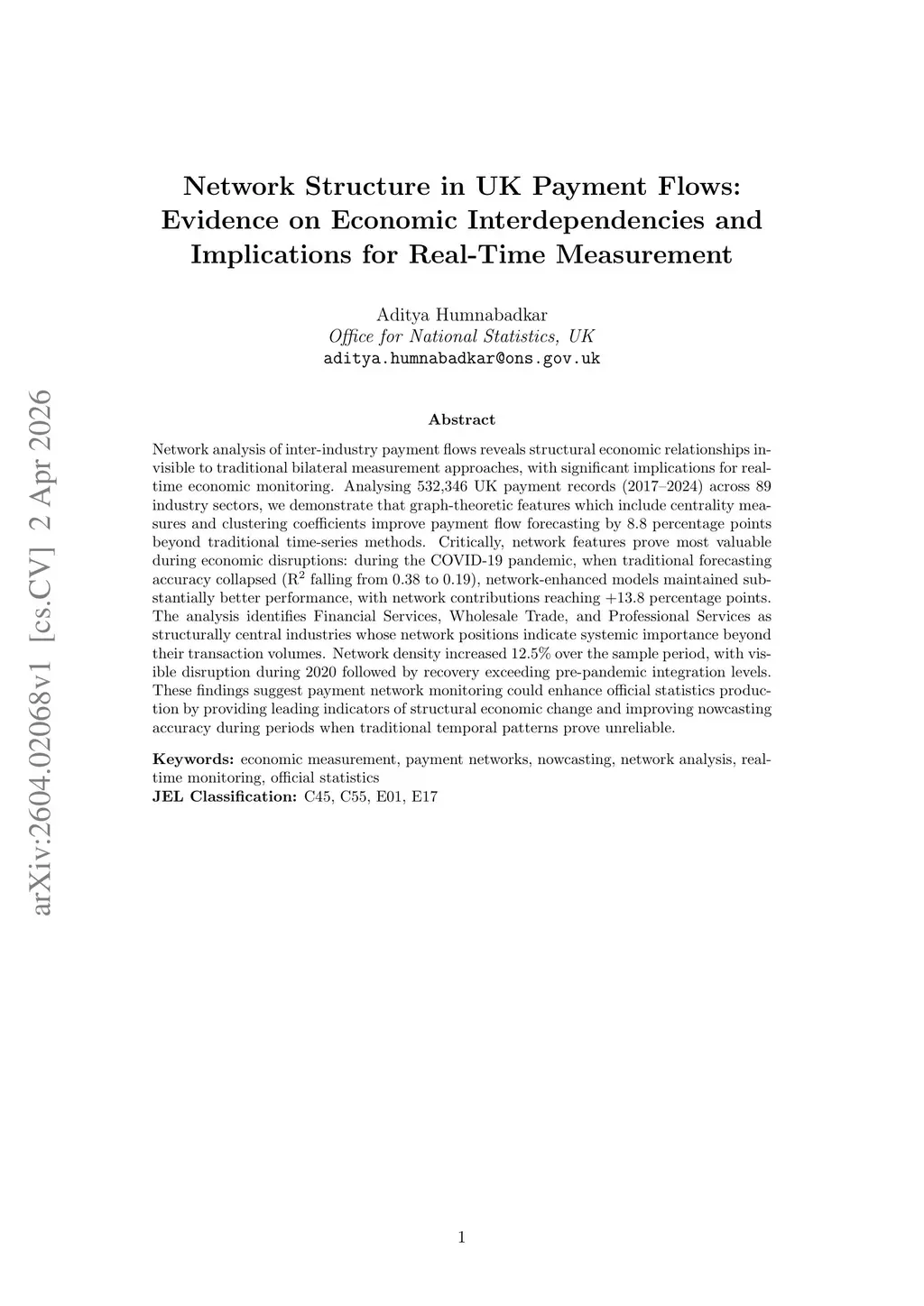 Network analysis of inter-industry payment flows reveals structural economic relationships invisible to traditional bilateral measurement approaches, with significant implications for real-time economic monitoring. Analysing 532,346 UK payment records (2017--2024) across 89 industry sectors, we demonstrate that graph-theoretic features which include centrality measures and clustering coefficients improve payment flow forecasting by 8.8 percentage points beyond traditional time-series methods. Critically, network features prove most valuable during economic disruptions: during the COVID-19 pandemic, when traditional forecasting accuracy collapsed (R2} falling from 0.38 to 0.19), network-enhanced models maintained substantially better performance, with network contributions reaching +13.8 percentage points. The analysis identifies Financial Services, Wholesale Trade, and Professional Services as structurally central industries whose network positions indicate systemic importance beyond their transaction volumes. Network density increased 12.5\% over the sample period, with visible disruption during 2020 followed by recovery exceeding pre-pandemic integration levels. These findings suggest payment network monitoring could enhance official statistics production by providing leading indicators of structural economic change and improving nowcasting accuracy during periods when traditional temporal patterns prove unreliable.