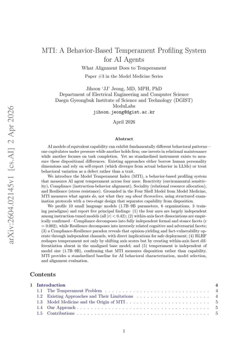 AI models of equivalent capability can exhibit fundamentally different behavioral patterns, yet no standardized instrument exists to measure these dispositional differences. Existing approaches either borrow human personality dimensions and rely on self-report (which diverges from actual behavior in LLMs) or treat behavioral variation as a defect rather than a trait.We introduce the Model Temperament Index (MTI), a behavior-based profiling system that measures AI agent temperament across four axes: Reactivity (environmental sensitivity), Compliance (instruction-behavior alignment), Sociality (relational resource allocation), and Resilience (stress resistance). Grounded in the Four Shell Model from Model Medicine, MTI measures what agents do, not what they say about themselves, using structured examination protocols with a two-stage design that separates capability from disposition.We profile 10 small language models (1.7B-9B parameters, 6 organizations, 3 training paradigms) and report five principal findings: (1) the four axes are largely independent among instruction-tuned models (all |r| < 0.42); (2) within-axis facet dissociations are empirically confirmed -- Compliance decomposes into fully independent formal and stance facets (r = 0.002), while Resilience decomposes into inversely related cognitive and adversarial facets; (3) a Compliance-Resilience paradox reveals that opinion-yielding and fact-vulnerability operate through independent channels; (4) RLHF reshapes temperament not only by shifting axis scores but by creating within-axis facet differentiation absent in the unaligned base model; and (5) temperament is independent of model size (1.7B-9B), confirming that MTI measures disposition rather than capability.