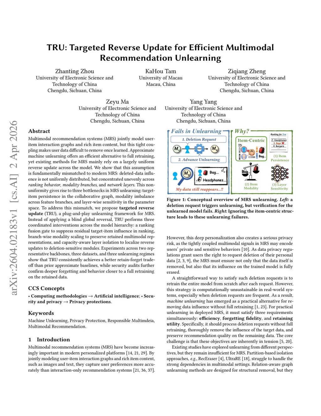Multimodal recommendation systems (MRS) jointly model user-item interaction graphs and rich item content, but this tight coupling makes user data difficult to remove once learned. Approximate machine unlearning offers an efficient alternative to full retraining, yet existing methods for MRS mainly rely on a largely uniform reverse update across the model. We show that this assumption is fundamentally mismatched to modern MRS: deleted-data influence is not uniformly distributed, but concentrated unevenly across \textit{ranking behavior}, \textit{modality branches}, and \textit{network layers}. This non-uniformity gives rise to three bottlenecks in MRS unlearning: target-item persistence in the collaborative graph, modality imbalance across feature branches, and layer-wise sensitivity in the parameter space. To address this mismatch, we propose \textbf{targeted reverse update} (TRU), a plug-and-play unlearning framework for MRS. Instead of applying a blind global reversal, TRU performs three coordinated interventions across the model hierarchy: a ranking fusion gate to suppress residual target-item influence in ranking, branch-wise modality scaling to preserve retained multimodal representations, and capacity-aware layer isolation to localize reverse updates to deletion-sensitive modules. Experiments across two representative backbones, three datasets, and three unlearning regimes show that TRU consistently achieves a better retain-forget trade-off than prior approximate baselines, while security audits further confirm deeper forgetting and behavior closer to a full retraining on the retained data.