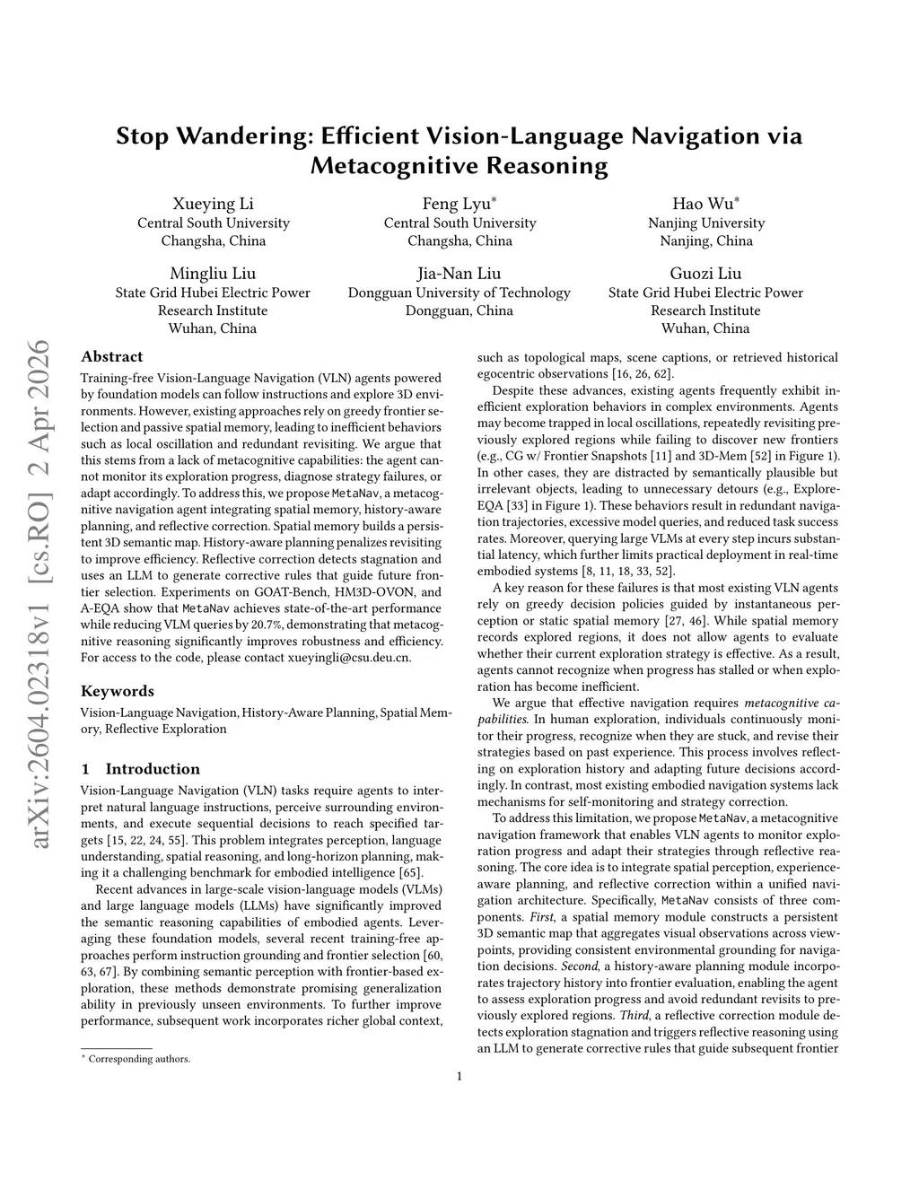 Training-free Vision-Language Navigation (VLN) agents powered by foundation models can follow instructions and explore 3D environments. However, existing approaches rely on greedy frontier selection and passive spatial memory, leading to inefficient behaviors such as local oscillation and redundant revisiting. We argue that this stems from a lack of metacognitive capabilities: the agent cannot monitor its exploration progress, diagnose strategy failures, or adapt accordingly. To address this, we propose MetaNav, a metacognitive navigation agent integrating spatial memory, history-aware planning, and reflective correction. Spatial memory builds a persistent 3D semantic map. History-aware planning penalizes revisiting to improve efficiency. Reflective correction detects stagnation and uses an LLM to generate corrective rules that guide future frontier selection. Experiments on GOAT-Bench, HM3D-OVON, and A-EQA show that MetaNav achieves state-of-the-art performance while reducing VLM queries by 20.7%, demonstrating that metacognitive reasoning significantly improves robustness and efficiency.