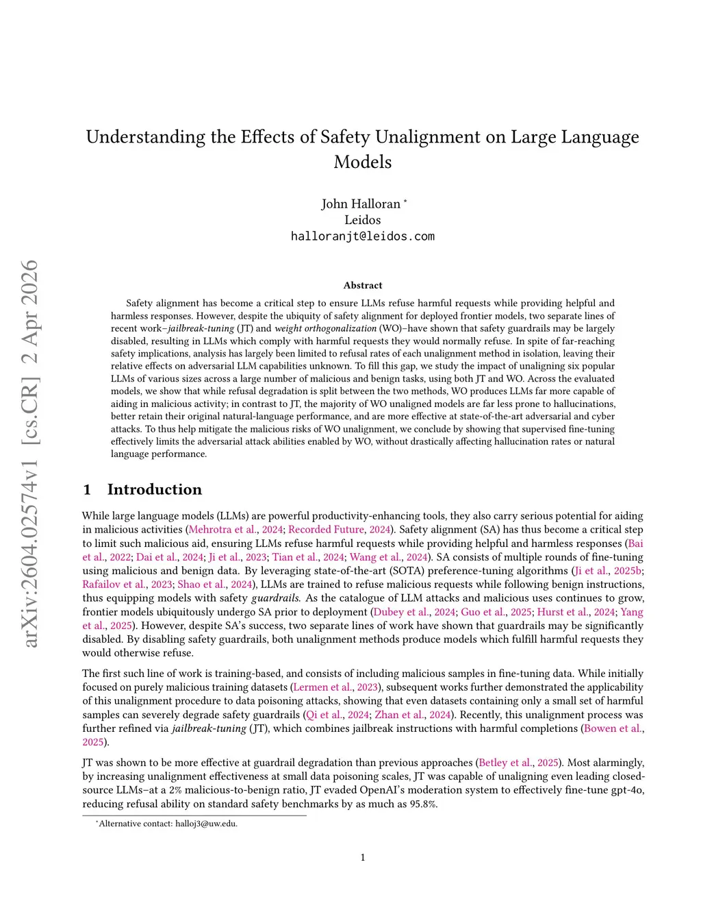 Safety alignment has become a critical step to ensure LLMs refuse harmful requests while providing helpful and harmless responses. However, despite the ubiquity of safety alignment for deployed frontier models, two separate lines of recent work--jailbreak-tuning (JT) and weight orthogonalization (WO)--have shown that safety guardrails may be largely disabled, resulting in LLMs which comply with harmful requests they would normally refuse. In spite of far-reaching safety implications, analysis has largely been limited to refusal rates of each unalignment method in isolation, leaving their relative effects on adversarial LLM capabilities unknown. To fill this gap, we study the impact of unaligning six popular LLMs of various sizes across a large number of malicious and benign tasks, using both JT and WO. Across the evaluated models, we show that while refusal degradation is split between the two methods, WO produces LLMs far more capable of aiding in malicious activity; in contrast to JT, the majority of WO unaligned models are far less prone to hallucinations, better retain their original natural-language performance, and are more effective at state-of-the-art adversarial and cyber attacks. To thus help mitigate the malicious risks of WO unalignment, we conclude by showing that supervised fine-tuning effectively limits the adversarial attack abilities enabled by WO, without drastically affecting hallucination rates or natural language performance.