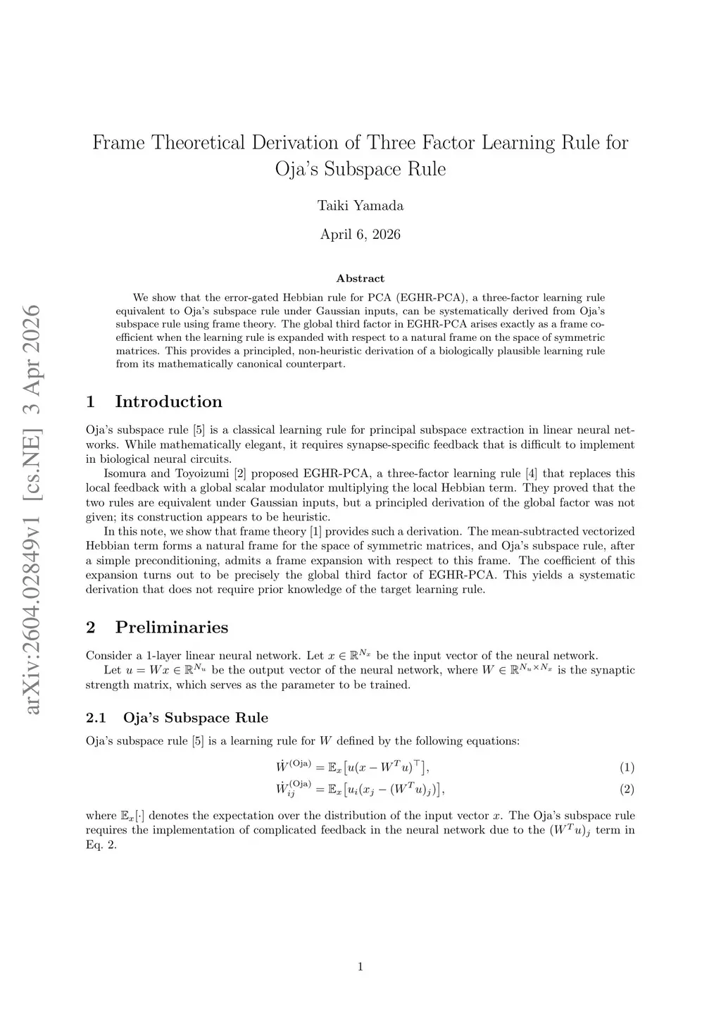 We show that the error-gated Hebbian rule for PCA (EGHR-PCA), a three-factor learning rule equivalent to Oja's subspace rule under Gaussian inputs, can be systematically derived from Oja's subspace rule using frame theory. The global third factor in EGHR-PCA arises exactly as a frame coefficient when the learning rule is expanded with respect to a natural frame on the space of symmetric matrices. This provides a principled, non-heuristic derivation of a biologically plausible learning rule from its mathematically canonical counterpart.