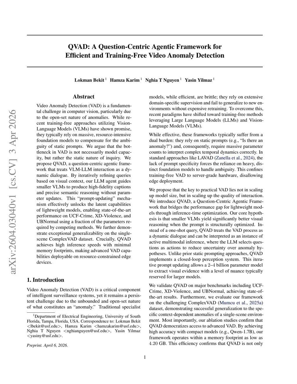 Video Anomaly Detection (VAD) is a fundamental challenge in computer vision, particularly due to the open-set nature of anomalies. While recent training-free approaches utilizing Vision-Language Models (VLMs) have shown promise, they typically rely on massive, resource-intensive foundation models to compensate for the ambiguity of static prompts. We argue that the bottleneck in VAD is not necessarily model capacity, but rather the static nature of inquiry. We propose QVAD, a question-centric agentic framework that treats VLM-LLM interaction as a dynamic dialogue. By iteratively refining queries based on visual context, our LLM agent guides smaller VLMs to produce high-fidelity captions and precise semantic reasoning without parameter updates. This ``prompt-updating" mechanism effectively unlocks the latent capabilities of lightweight models, enabling state-of-the-art performance on UCF-Crime, XD-Violence, and UBNormal using a fraction of the parameters required by competing methods. We further demonstrate exceptional generalizability on the single-scene ComplexVAD dataset. Crucially, QVAD achieves high inference speeds with minimal memory footprints, making advanced VAD capabilities deployable on resource-constrained edge devices.