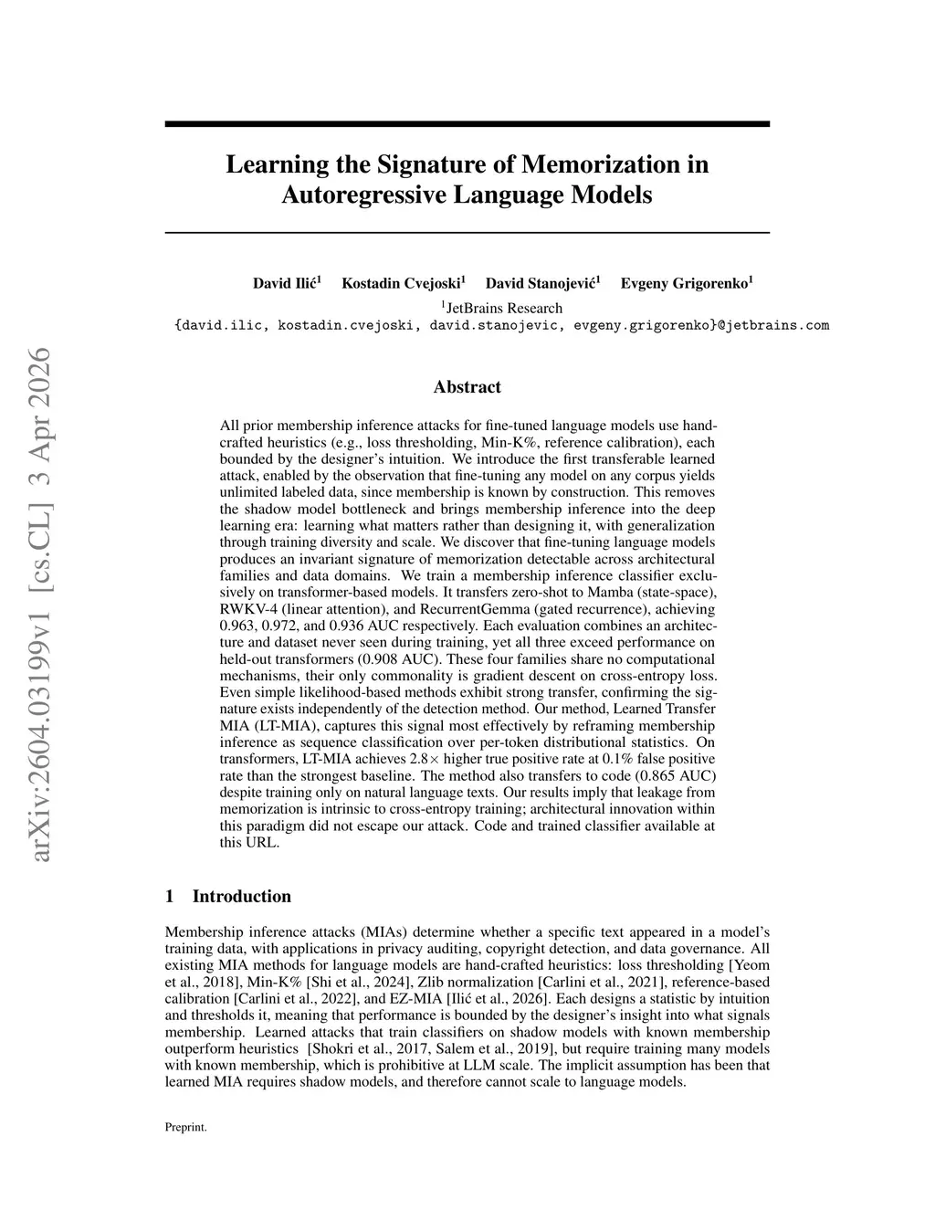 All prior membership inference attacks for fine-tuned language models use hand-crafted heuristics (e.g., loss thresholding, Min-K\%, reference calibration), each bounded by the designer's intuition. We introduce the first transferable learned attack, enabled by the observation that fine-tuning any model on any corpus yields unlimited labeled data, since membership is known by construction. This removes the shadow model bottleneck and brings membership inference into the deep learning era: learning what matters rather than designing it, with generalization through training diversity and scale. We discover that fine-tuning language models produces an invariant signature of memorization detectable across architectural families and data domains. We train a membership inference classifier exclusively on transformer-based models. It transfers zero-shot to Mamba (state-space), RWKV-4 (linear attention), and RecurrentGemma (gated recurrence), achieving 0.963, 0.972, and 0.936 AUC respectively. Each evaluation combines an architecture and dataset never seen during training, yet all three exceed performance on held-out transformers (0.908 AUC). These four families share no computational mechanisms, their only commonality is gradient descent on cross-entropy loss. Even simple likelihood-based methods exhibit strong transfer, confirming the signature exists independently of the detection method. Our method, Learned Transfer MIA (LT-MIA), captures this signal most effectively by reframing membership inference as sequence classification over per-token distributional statistics. On transformers, LT-MIA achieves 2.8 higher TPR at 0.1\% FPR than the strongest baseline. The method also transfers to code (0.865 AUC) despite training only on natural language texts. Code and trained classifier available atthis https URL.