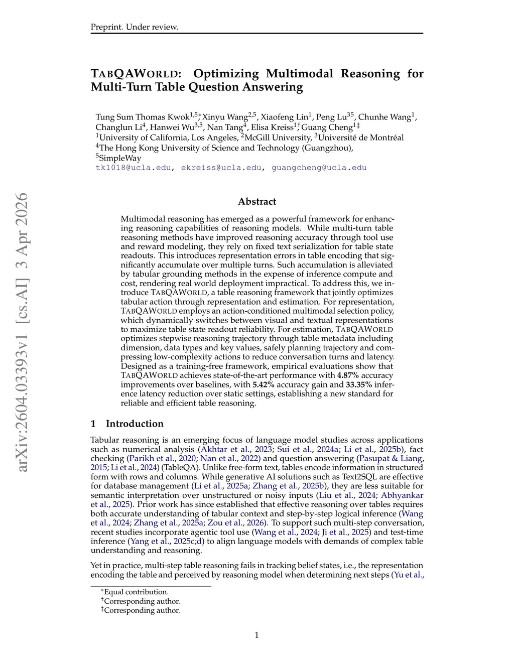 Multimodal reasoning has emerged as a powerful framework for enhancing reasoning capabilities of reasoning models. While multi-turn table reasoning methods have improved reasoning accuracy through tool use and reward modeling, they rely on fixed text serialization for table state readouts. This introduces representation errors in table encoding that significantly accumulate over multiple turns. Such accumulation is alleviated by tabular grounding methods in the expense of inference compute and cost, rendering real world deployment impractical. To address this, we introduce TABQAWORLD, a table reasoning framework that jointly optimizes tabular action through representation and estimation. For representation, TABQAWORLD employs an action-conditioned multimodal selection policy, which dynamically switches between visual and textual representations to maximize table state readout reliability. For estimation, TABQAWORLD optimizes stepwise reasoning trajectory through table metadata including dimension, data types and key values, safely planning trajectory and compressing low-complexity actions to reduce conversation turns and latency. Designed as a training-free framework, empirical evaluations show that TABQAWORLD achieves state-of-the-art performance with 4.87% accuracy improvements over baselines, with 5.42% accuracy gain and 33.35% inference latency reduction over static settings, establishing a new standard for reliable and efficient table reasoning.