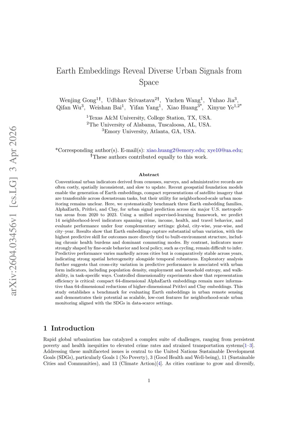 Conventional urban indicators derived from censuses, surveys, and administrative records are often costly, spatially inconsistent, and slow to update. Recent geospatial foundation models enable Earth embeddings, compact satellite image representations transferable across downstream tasks, but their utility for neighborhood-scale urban monitoring remains unclear. Here, we benchmark three Earth embedding families, AlphaEarth, Prithvi, and Clay, for urban signal prediction across six U.S. metropolitan areas from 2020 to 2023. Using a unified supervised-learning framework, we predict 14 neighborhood-level indicators spanning crime, income, health, and travel behavior, and evaluate performance under four settings: global, city-wise, year-wise, and city-year. Results show that Earth embeddings capture substantial urban variation, with the highest predictive skill for outcomes more directly tied to built-environment structure, including chronic health burdens and dominant commuting modes. By contrast, indicators shaped more strongly by fine-scale behavior and local policy, such as cycling, remain difficult to infer. Predictive performance varies markedly across cities but remains comparatively stable across years, indicating strong spatial heterogeneity alongside temporal robustness. Exploratory analysis suggests that cross-city variation in predictive performance is associated with urban form in task-specific ways. Controlled dimensionality experiments show that representation efficiency is critical: compact 64-dimensional AlphaEarth embeddings remain more informative than 64-dimensional reductions of Prithvi and Clay. This study establishes a benchmark for evaluating Earth embeddings in urban remote sensing and demonstrates their potential as scalable, low-cost features for SDG-aligned neighborhood-scale urban monitoring.