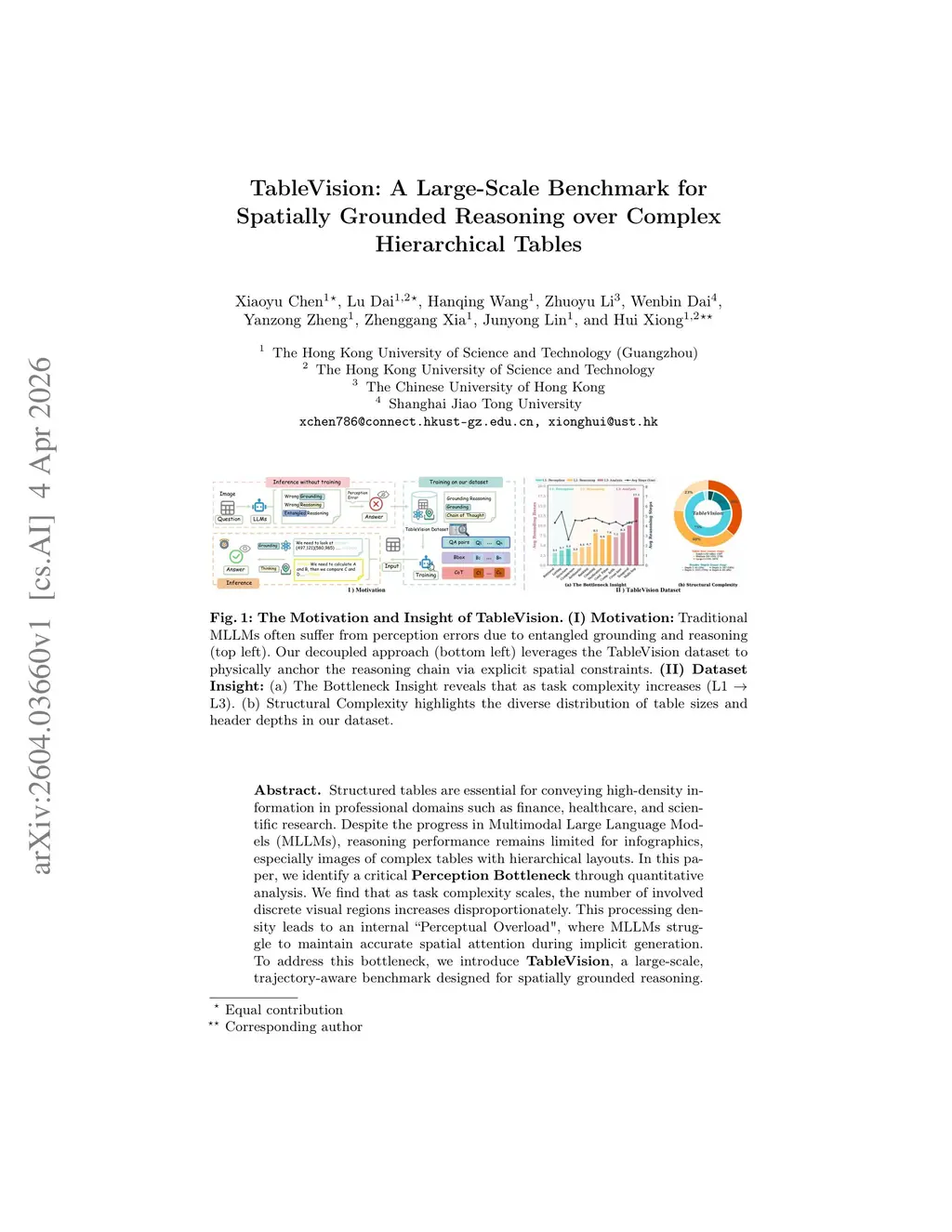 Structured tables are essential for conveying high-density information in professional domains such as finance, healthcare, and scientific research. Despite the progress in Multimodal Large Language Models (MLLMs), reasoning performance remains limited for complex tables with hierarchical layouts. In this paper, we identify a critical Perception Bottleneck through quantitative analysis. We find that as task complexity scales, the number of involved discrete visual regions increases disproportionately. This processing density leads to an internal "Perceptual Overload," where MLLMs struggle to maintain accurate spatial attention during implicit generation. To address this bottleneck, we introduce TableVision, a large-scale, trajectory-aware benchmark designed for spatially grounded reasoning. TableVision stratifies tabular tasks into three cognitive levels (Perception, Reasoning, and Analysis) across 13 sub-categories. By utilizing a rendering-based deterministic grounding pipeline, the dataset explicitly couples multi-step logical deductions with pixel-perfect spatial ground truths, comprising 6,799 high-fidelity reasoning trajectories. Our empirical results, supported by diagnostic probing, demonstrate that explicit spatial constraints significantly recover the reasoning potential of MLLMs. Furthermore, our two-stage decoupled framework achieves a robust 12.3% overall accuracy improvement on the test set. TableVision provides a rigorous testbed and a fresh perspective on the synergy between perception and logic in document understanding.
