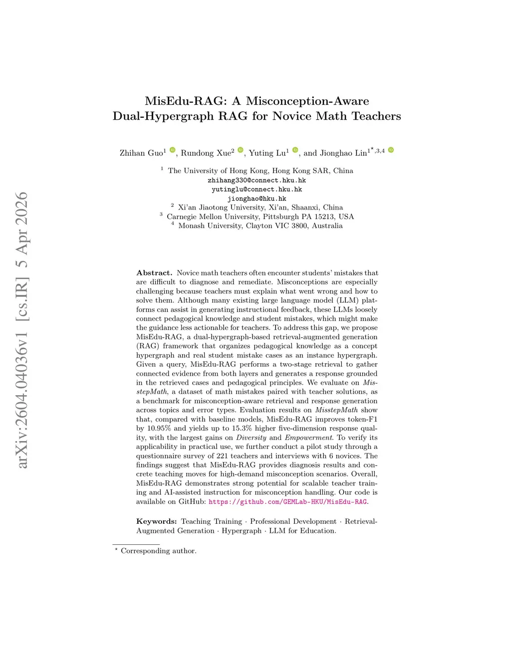 Novice math teachers often encounter students' mistakes that are difficult to diagnose and remediate. Misconceptions are especially challenging because teachers must explain what went wrong and how to solve them. Although many existing large language model (LLM) platforms can assist in generating instructional feedback, these LLMs loosely connect pedagogical knowledge and student mistakes, which might make the guidance less actionable for teachers. To address this gap, we propose MisEdu-RAG, a dual-hypergraph-based retrieval-augmented generation (RAG) framework that organizes pedagogical knowledge as a concept hypergraph and real student mistake cases as an instance hypergraph. Given a query, MisEdu-RAG performs a two-stage retrieval to gather connected evidence from both layers and generates a response grounded in the retrieved cases and pedagogical principles. We evaluate on \textit{MisstepMath}, a dataset of math mistakes paired with teacher solutions, as a benchmark for misconception-aware retrieval and response generation across topics and error types. Evaluation results on \textit{MisstepMath} show that, compared with baseline models, MisEdu-RAG improves token-F1 by 10.95\% and yields up to 15.3\% higher five-dimension response quality, with the largest gains on \textit{Diversity} and \textit{Empowerment}. To verify its applicability in practical use, we further conduct a pilot study through a questionnaire survey of 221 teachers and interviews with 6 novices. The findings suggest that MisEdu-RAG provides diagnosis results and concrete teaching moves for high-demand misconception scenarios. Overall, MisEdu-RAG demonstrates strong potential for scalable teacher training and AI-assisted instruction for misconception handling. Our code is available on GitHub:this https URL.