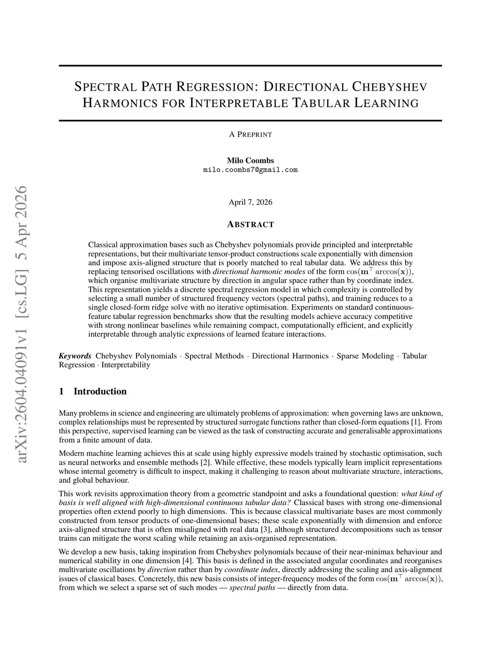 Classical approximation bases such as Chebyshev polynomials provide principled and interpretable representations, but their multivariate tensor-product constructions scale exponentially with dimension and impose axis-aligned structure that is poorly matched to real tabular data. We address this by replacing tensorised oscillations with directional harmonic modes of the form , which organise multivariate structure by direction in angular space rather than by coordinate index. This representation yields a discrete spectral regression model in which complexity is controlled by selecting a small number of structured frequency vectors (spectral paths), and training reduces to a single closed-form ridge solve with no iterative optimisation. Experiments on standard continuous-feature tabular regression benchmarks show that the resulting models achieve accuracy competitive with strong nonlinear baselines while remaining compact, computationally efficient, and explicitly interpretable through analytic expressions of learned feature interactions.
