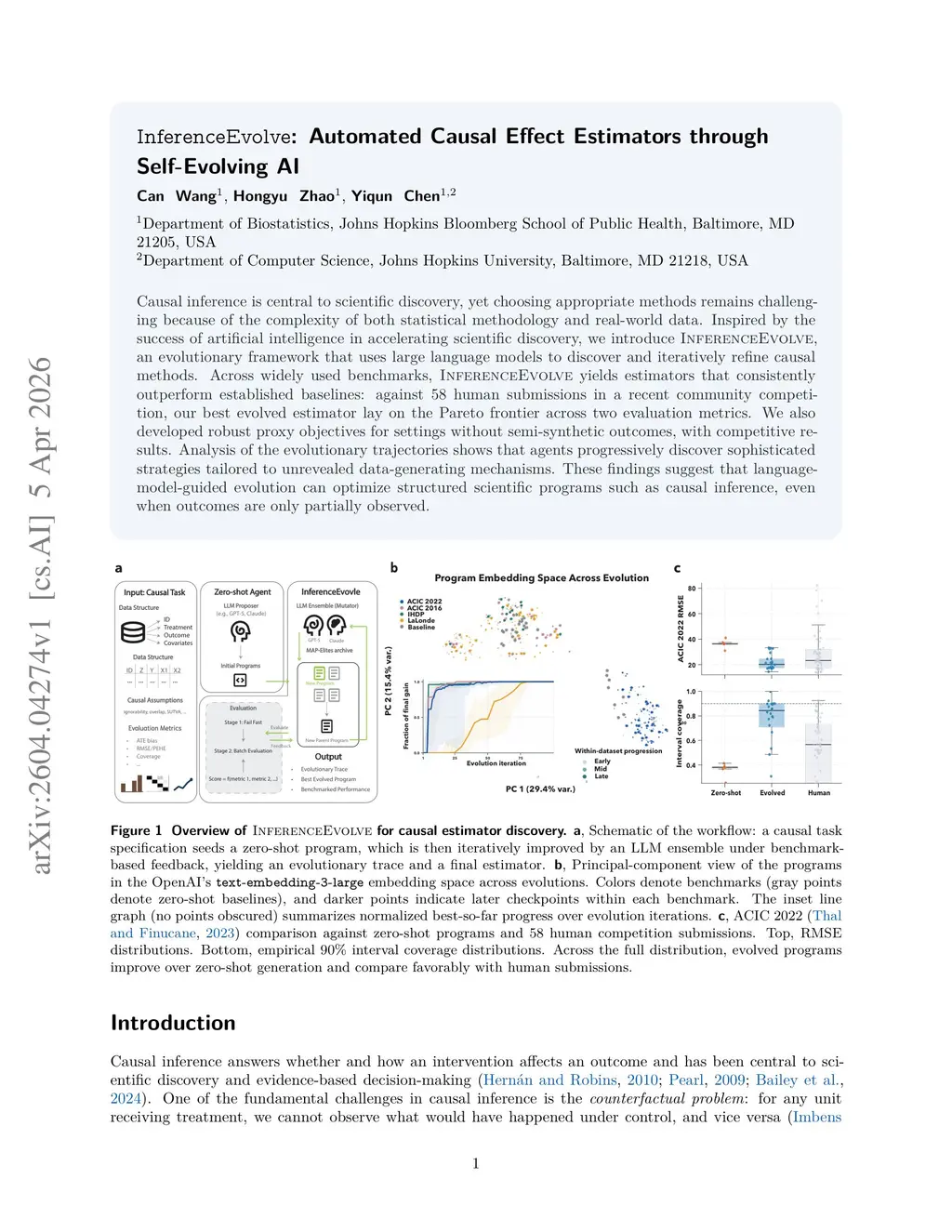 Causal inference is central to scientific discovery, yet choosing appropriate methods remains challenging because of the complexity of both statistical methodology and real-world data. Inspired by the success of artificial intelligence in accelerating scientific discovery, we introduce InferenceEvolve, an evolutionary framework that uses large language models to discover and iteratively refine causal methods. Across widely used benchmarks, InferenceEvolve yields estimators that consistently outperform established baselines: against 58 human submissions in a recent community competition, our best evolved estimator lay on the Pareto frontier across two evaluation metrics. We also developed robust proxy objectives for settings without semi-synthetic outcomes, with competitive results. Analysis of the evolutionary trajectories shows that agents progressively discover sophisticated strategies tailored to unrevealed data-generating mechanisms. These findings suggest that language-model-guided evolution can optimize structured scientific programs such as causal inference, even when outcomes are only partially observed.