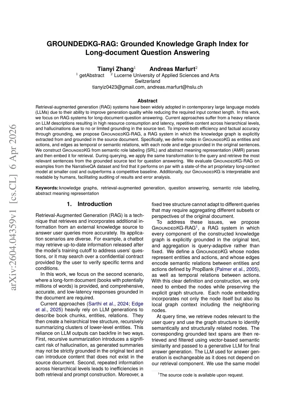 Retrieval-augmented generation (RAG) systems have been widely adopted in contemporary large language models (LLMs) due to their ability to improve generation quality while reducing the required input context length. In this work, we focus on RAG systems for long-document question answering. Current approaches suffer from a heavy reliance on LLM descriptions resulting in high resource consumption and latency, repetitive content across hierarchical levels, and hallucinations due to no or limited grounding in the source text. To improve both efficiency and factual accuracy through grounding, we propose GroundedKG-RAG, a RAG system in which the knowledge graph is explicitly extracted from and grounded in the source document. Specifically, we define nodes in GroundedKG as entities and actions, and edges as temporal or semantic relations, with each node and edge grounded in the original sentences. We construct GroundedKG from semantic role labeling (SRL) and abstract meaning representation (AMR) parses and then embed it for retrieval. During querying, we apply the same transformation to the query and retrieve the most relevant sentences from the grounded source text for question answering. We evaluate GroundedKG-RAG on examples from the NarrativeQA dataset and find that it performs on par with a state-of-the art proprietary long-context model at smaller cost and outperforms a competitive baseline. Additionally, our GroundedKG is interpretable and readable by humans, facilitating auditing of results and error analysis.