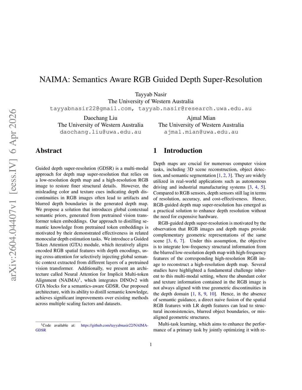 NAIMA: Semantics Aware RGB Guided Depth Super-Resolution