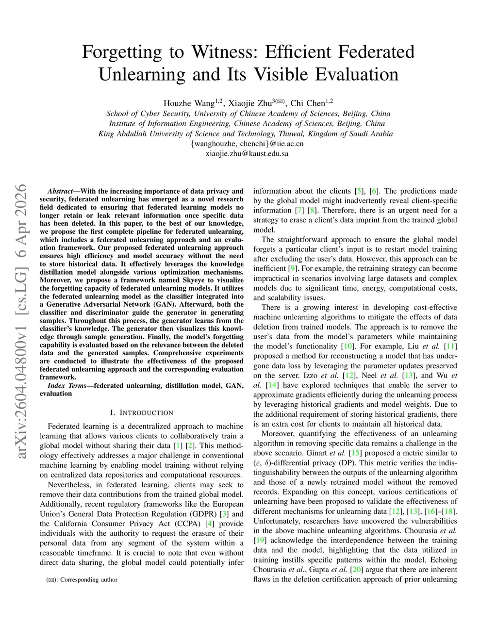 With the increasing importance of data privacy and security, federated unlearning has emerged as a novel research field dedicated to ensuring that federated learning models no longer retain or leak relevant information once specific data has been deleted. In this paper, to the best of our knowledge, we propose the first complete pipeline for federated unlearning, which includes a federated unlearning approach and an evaluation framework. Our proposed federated unlearning approach ensures high efficiency and model accuracy without the need to store historicalthis http URLeffectively leverages the knowledge distillation model alongside various optimization mechanisms. Moreover, we propose a framework named Skyeye to visualize the forgetting capacity of federated unlearning models. It utilizes the federated unlearning model as the classifier integrated into a Generative Adversarial Network (GAN). Afterward, both the classifier and discriminator guide the generator in generating samples. Throughout this process, the generator learns from the classifier's knowledge. The generator then visualizes this knowledge through sample generation. Finally, the model's forgetting capability is evaluated based on the relevance between the deleted data and the generated samples. Comprehensive experiments are conducted to illustrate the effectiveness of the proposed federated unlearning approach and the corresponding evaluation framework.