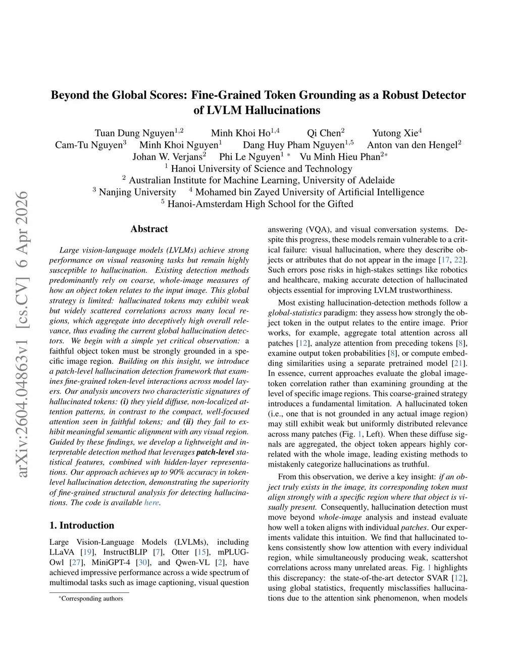 Large vision-language models (LVLMs) achieve strong performance on visual reasoning tasks but remain highly susceptible to hallucination. Existing detection methods predominantly rely on coarse, whole-image measures of how an object token relates to the input image. This global strategy is limited: hallucinated tokens may exhibit weak but widely scattered correlations across many local regions, which aggregate into deceptively high overall relevance, thus evading the current global hallucination detectors. We begin with a simple yet critical observation: a faithful object token must be strongly grounded in a specific image region. Building on this insight, we introduce a patch-level hallucination detection framework that examines fine-grained token-level interactions across model layers. Our analysis uncovers two characteristic signatures of hallucinated tokens: (i) they yield diffuse, non-localized attention patterns, in contrast to the compact, well-focused attention seen in faithful tokens; and (ii) they fail to exhibit meaningful semantic alignment with any visual region. Guided by these findings, we develop a lightweight and interpretable detection method that leverages patch-level statistical features, combined with hidden-layer representations. Our approach achieves up to 90% accuracy in token-level hallucination detection, demonstrating the superiority of fine-grained structural analysis for detecting hallucinations.