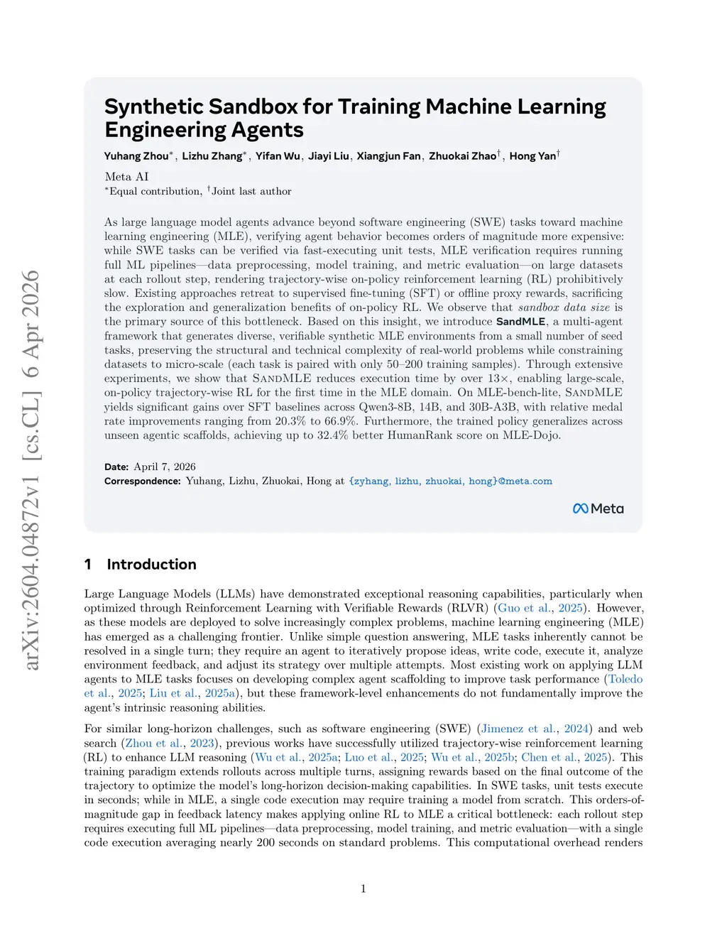 As large language model agents advance beyond software engineering (SWE) tasks toward machine learning engineering (MLE), verifying agent behavior becomes orders of magnitude more expensive: while SWE tasks can be verified via fast-executing unit tests, MLE verification requires running full ML pipelines -- data preprocessing, model training, and metric evaluation -- on large datasets at each rollout step, rendering trajectory-wise on-policy reinforcement learning (RL) prohibitively slow. Existing approaches retreat to supervised fine-tuning (SFT) or offline proxy rewards, sacrificing the exploration and generalization benefits of on-policy RL. We observe that sandbox data size is the primary source of this bottleneck. Based on this insight, we introduce SandMLE, a multi-agent framework that generates diverse, verifiable synthetic MLE environments from a small number of seed tasks, preserving the structural and technical complexity of real-world problems while constraining datasets to micro-scale (each task is paired with only 50-200 training samples). Through extensive experiments, we show that SandMLE reduces execution time by over 13 times, enabling large-scale, on-policy trajectory-wise RL for the first time in the MLE domain. On MLE-bench-lite, SandMLE yields significant gains over SFT baselines across Qwen3-8B, 14B, and 30B-A3B, with relative medal rate improvements ranging from 20.3% to 66.9%. Furthermore, the trained policy generalizes across unseen agentic scaffolds, achieving up to 32.4% better HumanRank score on MLE-Dojo.