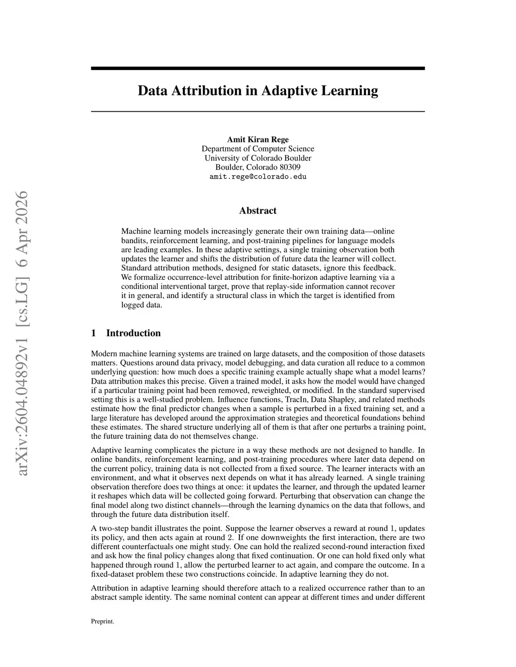 Machine learning models increasingly generate their own training data -- online bandits, reinforcement learning, and post-training pipelines for language models are leading examples. In these adaptive settings, a single training observation both updates the learner and shifts the distribution of future data the learner will collect. Standard attribution methods, designed for static datasets, ignore this feedback. We formalize occurrence-level attribution for finite-horizon adaptive learning via a conditional interventional target, prove that replay-side information cannot recover it in general, and identify a structural class in which the target is identified from logged data.