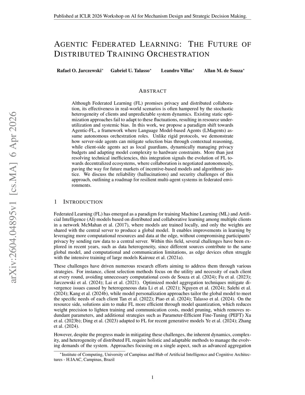 Although Federated Learning (FL) promises privacy and distributed collaboration, its effectiveness in real-world scenarios is often hampered by the stochastic heterogeneity of clients and unpredictable system dynamics. Existing static optimization approaches fail to adapt to these fluctuations, resulting in resource underutilization and systemic bias. In this work, we propose a paradigm shift towards Agentic-FL, a framework where Language Model-based Agents (LMagents) assume autonomous orchestration roles. Unlike rigid protocols, we demonstrate how server-side agents can mitigate selection bias through contextual reasoning, while client-side agents act as local guardians, dynamically managing privacy budgets and adapting model complexity to hardware constraints. More than just resolving technical inefficiencies, this integration signals the evolution of FL towards decentralized ecosystems, where collaboration is negotiated autonomously, paving the way for future markets of incentive-based models and algorithmic justice. We discuss the reliability (hallucinations) and security challenges of this approach, outlining a roadmap for resilient multi-agent systems in federated environments.