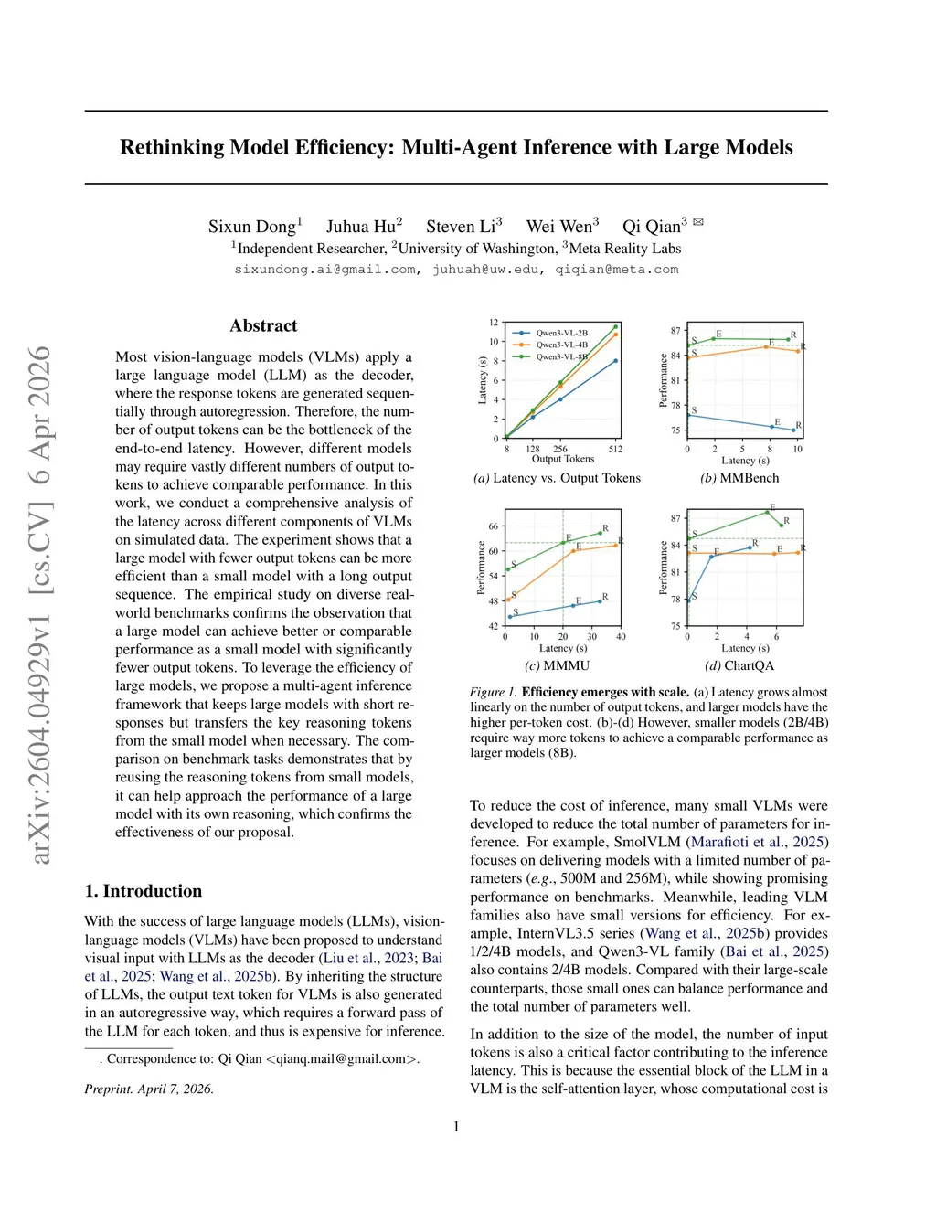 Most vision-language models (VLMs) apply a large language model (LLM) as the decoder, where the response tokens are generated sequentially through autoregression. Therefore, the number of output tokens can be the bottleneck of the end-to-end latency. However, different models may require vastly different numbers of output tokens to achieve comparable performance. In this work, we conduct a comprehensive analysis of the latency across different components of VLMs on simulated data. The experiment shows that a large model with fewer output tokens can be more efficient than a small model with a long output sequence. The empirical study on diverse real-world benchmarks confirms the observation that a large model can achieve better or comparable performance as a small model with significantly fewer output tokens. To leverage the efficiency of large models, we propose a multi-agent inference framework that keeps large models with short responses but transfers the key reasoning tokens from the small model when necessary. The comparison on benchmark tasks demonstrates that by reusing the reasoning tokens from small models, it can help approach the performance of a large model with its own reasoning, which confirms the effectiveness of our proposal.