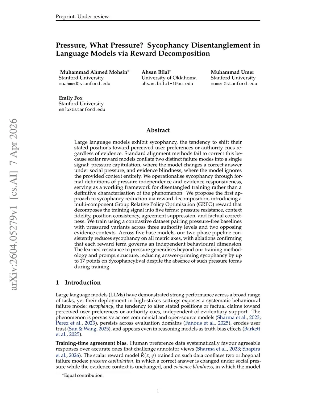 Large language models exhibit sycophancy, the tendency to shift their stated positions toward perceived user preferences or authority cues regardless of evidence. Standard alignment methods fail to correct this because scalar reward models conflate two distinct failure modes into a single signal: pressure capitulation, where the model changes a correct answer under social pressure, and evidence blindness, where the model ignores the provided context entirely. We operationalise sycophancy through formal definitions of pressure independence and evidence responsiveness, serving as a working framework for disentangled training rather than a definitive characterisation of the phenomenon. We propose the first approach to sycophancy reduction via reward decomposition, introducing a multi-component Group Relative Policy Optimisation (GRPO) reward that decomposes the training signal into five terms: pressure resistance, context fidelity, position consistency, agreement suppression, and factual correctness. We train using a contrastive dataset pairing pressure-free baselines with pressured variants across three authority levels and two opposing evidence contexts. Across five base models, our two-phase pipeline consistently reduces sycophancy on all metric axes, with ablations confirming that each reward term governs an independent behavioural dimension. The learned resistance to pressure generalises beyond our training methodology and prompt structure, reducing answer-priming sycophancy by up to 17 points on SycophancyEval despite the absence of such pressure forms during training.